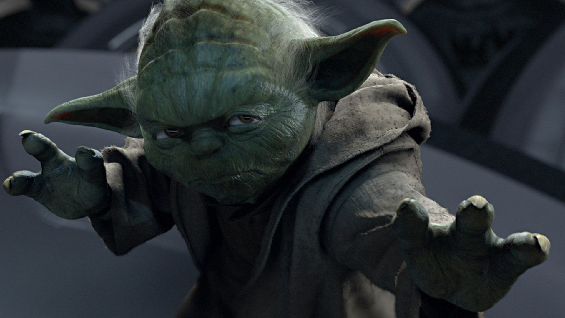 ヨーダとパルパティーン皇帝の間のクライマックスの決闘は、ムスタファーでのオビ=ワン・ケノービとアナキン・スカイウォーカーの戦いと並行して起こり、銀河の運命を決定します。これら 4 人のキャラクターは、主導権をめぐる争いに閉じ込められた、光の側と闇の側の対立する力を体現しています。ヨーダの確立された力(後の物語で一貫して強化されることになる力)を考えると、特にパルパティーンが直前にメイス・ウィンドゥにかろうじて勝ったことを考えると、パルパティーンに対する彼の敗北はいくぶん不自然に感じられた。