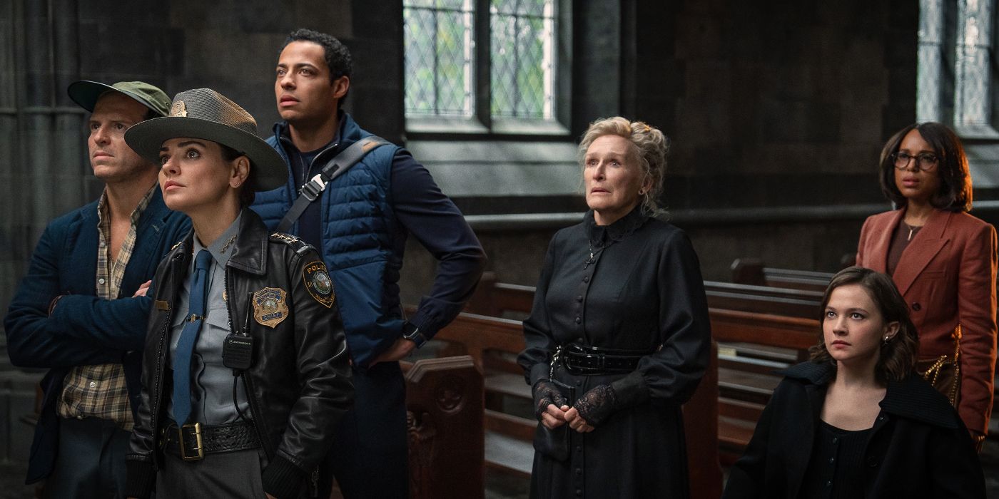 モンシニョール ウィックス教会の脇役にはおなじみの顔ぶれが揃っており、彼らのさまざまな個性が交流するのを見るのはいつも楽しいです。キャラクターたちがほぼ常に一緒だったグラス オニオンとは異なり、ウェイク アップ デッドマンはオリジナルのナイブズ アウトに似ており、アンサンブルが同じシーンにいることはあまりありません。これにより、実際に共有した瞬間がさらに魅力的なものになります。グループには、教会の帳簿係であるマーサ(グレン・クローズ)も含まれています。サムソン(トーマス・ヘイデン教会)、グラウンドキーパー。弁護士のベラ(ケリー・ワシントン)とその息子サイ(ダリル・マコーマック)。町医者のナット(ジェレミー・レナー)。著者リー・ロス(アンドリュー・スコット)。そしてチェリストのシモーネ(カイリー・スペイニー)。キャラクターの多くは、有名な俳優によって命を吹き込まれた、見覚えのあるタイプのように感じられ、それらの俳優が普段の役柄と対峙するのを見るのは楽しいです。本のお金で家の周りに堀を築いた偏執的な作家としてのアンドリュー・スコットを見たいと思ったことがあるなら、この映画はあなたのためです。