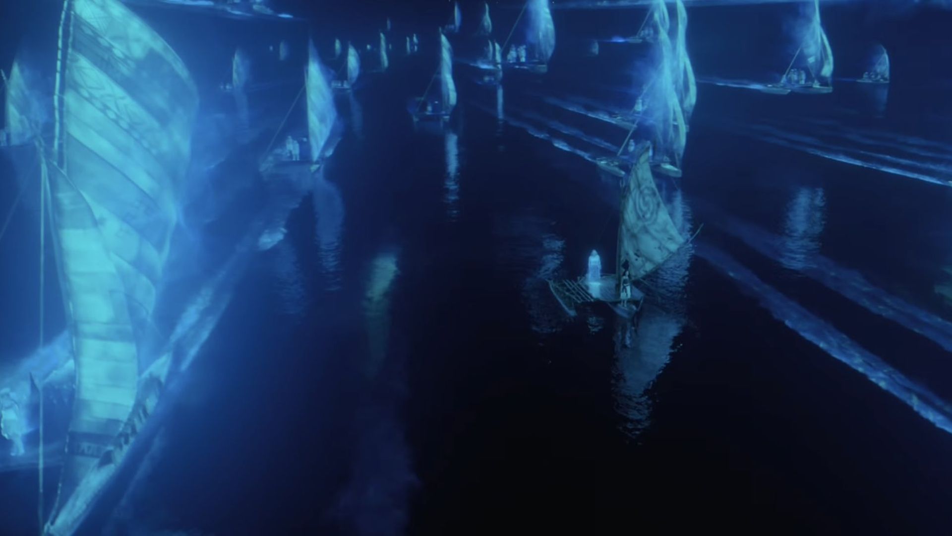 オリジナルのモアナの中で最も力強いシーンの 1 つは、「I Am Moana (Song of the Ancestors)」という曲中に起こります。それは、モアナが自分のアイデンティティの両方の側面、つまり首長の娘としての役割と古代の航海者の子孫としての冒険心を完全に受け入れるときです。彼女が有名なセリフ「私はモアナ!」を歌うとき、彼女は海に浮かぶ祖先たちの輝く霊的な船に囲まれています。実写リメイク版ではこのシーンが厳密に再現されており、暗闇の中にモアナが一人、生物発光船に照らされているが、若干緑がかっており、曲「How Far I’ll Go」の瞬間を反映しているようだ。