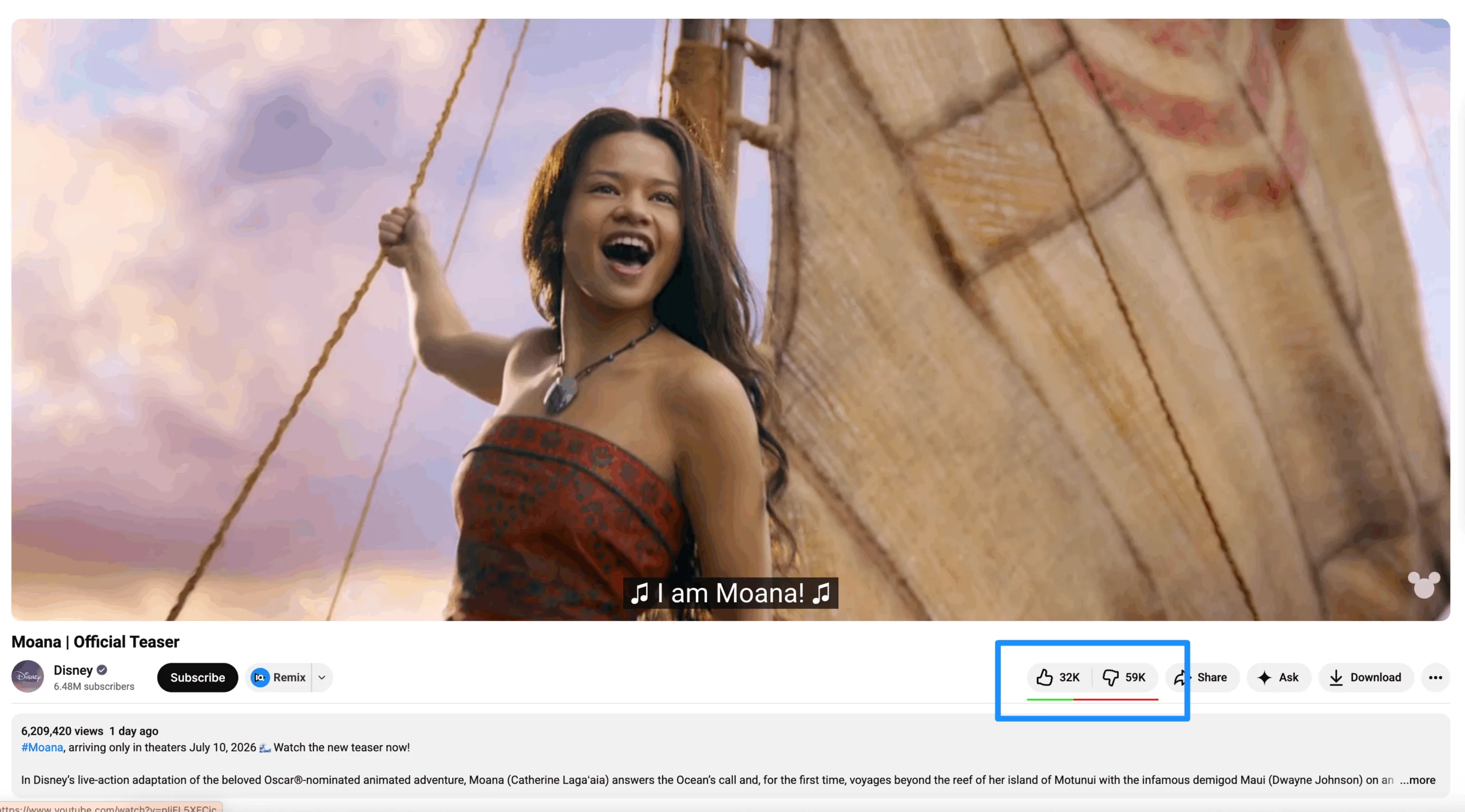 ディズニーは最近、近日公開予定の実写映画「モアナ」の初公開を公開したが、本当の話題は映画自体についてではなく、公開直後に YouTube で受け取った予告編に対する圧倒的な数の低評価だ。