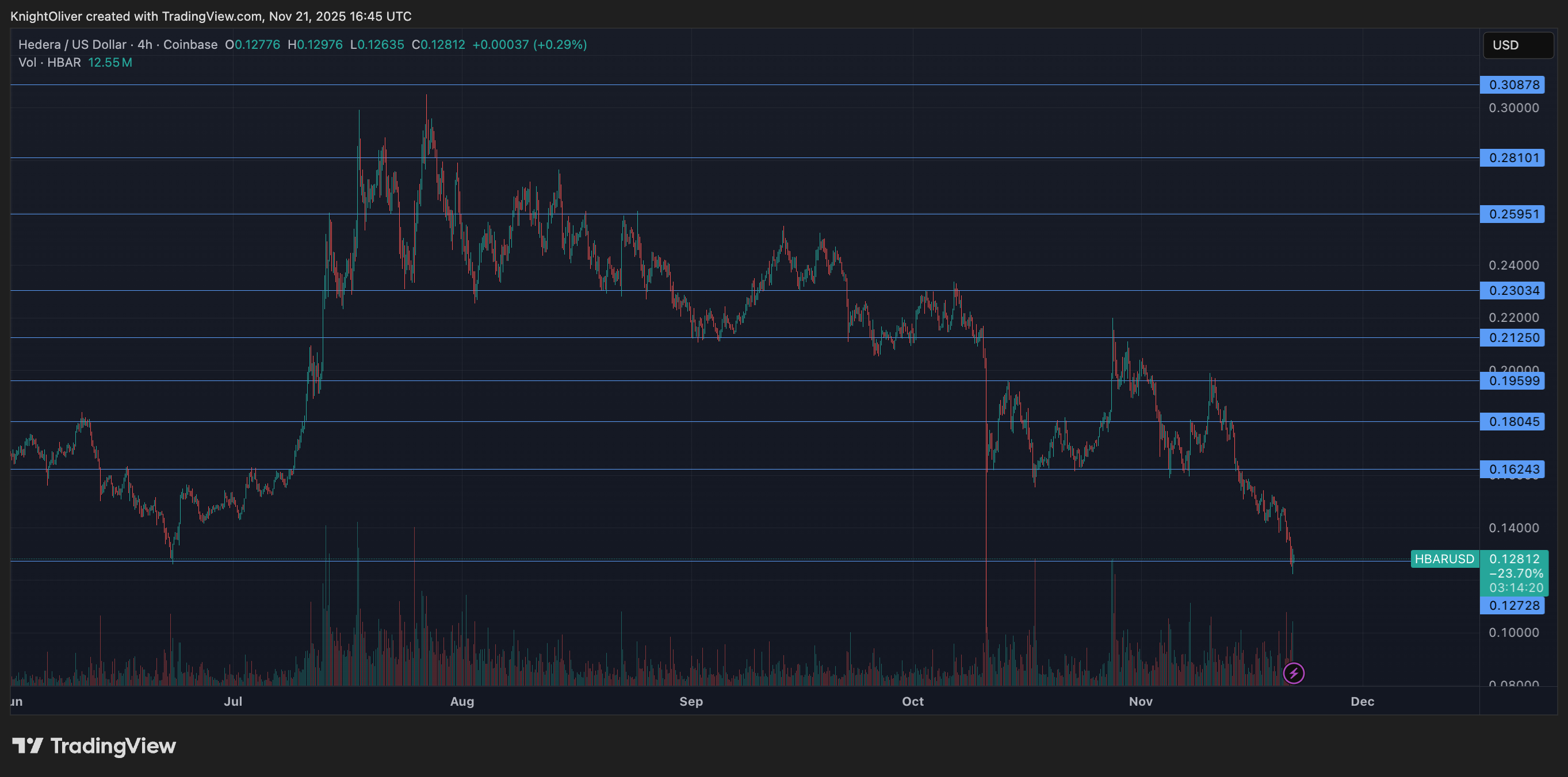 取引終了時間が近づくと、パニック売りが最高値を更新した。 HBAR は 0.1317 ドルから 0.1277 ドルまで下落し、出来高は大晦日の花火のように 876 万ドルと 1113 万ドルに急増しました。そして、突然、活動が停止しました。おそらく誰かが巨大な赤旗を振ったか、技術的な不具合によって、すべてが一時停止に見舞われたのと同じです。反転の兆候かもしれない(あるいは仮想通貨が仮想通貨であるだけ)が、今のところクマたちは運動会をしている。