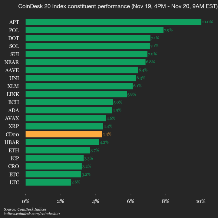 デジタル資産の著名なコレクションであるコインデスク 20 は現在 2954.76 で順調に推移しています。これは午後 4 時から 4.4% の上昇 (+123.58) です。東部時間水曜日。確かに、これはテクノロジーに精通した人やカフェインを燃料とする人にとっては喜びの光景です。