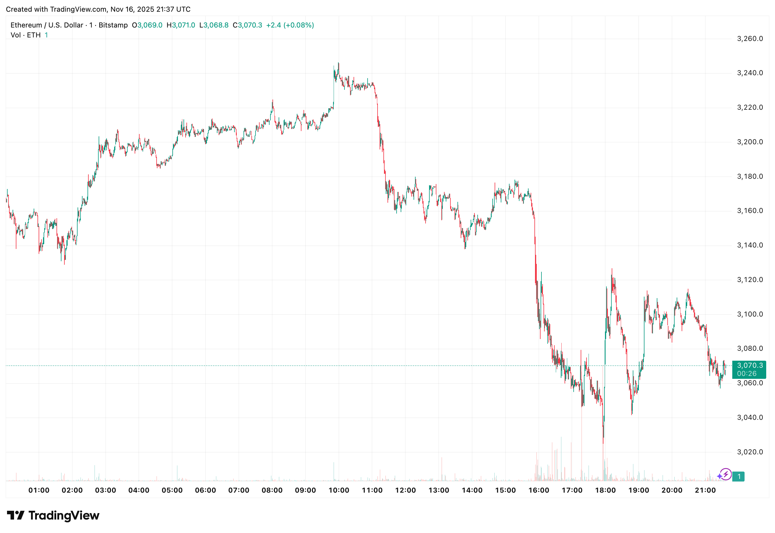- エーテル、ああ、なんてことだ! 11月4日以来初めて3,100ドルを下回り、午後9時35分の時点で過去24時間で3.4%下落した。 UTC 11 月 16 日。打撲傷を数えているのは誰ですか?