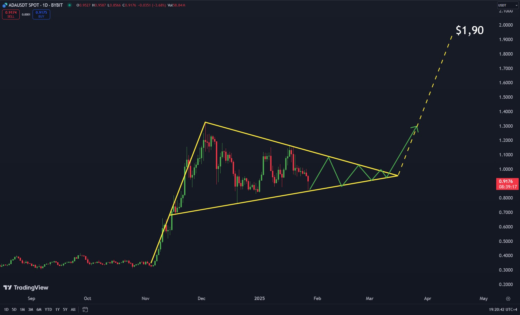 一方、チャートのささやき屋であるADAトレーダーのセバスチャン氏は、カルダノは0.95ドルを超えて一日を終える必要があると考えている。「この最後の日足が緑に変われば、ADAにとって素晴らしいことだ」と彼は考え、対称三角形内で終値をつける。以前、セバスチャン氏は、ADAの「痛みを伴う統合はまもなく終了するかもしれない」と述べていた。仮想通貨は「この対称三角形内のスペースがなくなり、まもなくブレイクアウトするかもしれない」からだ。ブレイクアウト、上向きのポンプ、ああ、可能性は無限大だ!