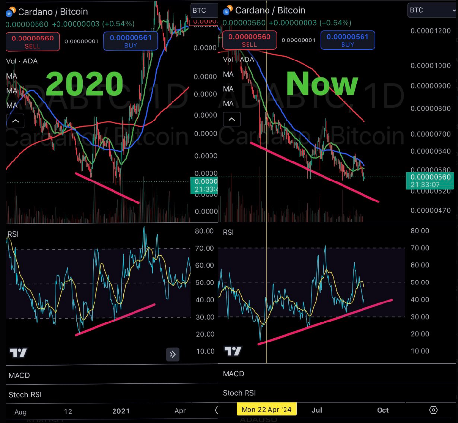 彼は大胆な予測を表現することにも躊躇しません。ガンバルデロ氏は最近の投稿で、ADAが困難に直面していた2020年の状況とよく似ていると指摘した。しかし、強気の乖離はビットコインに対する大幅な上昇を引き起こし、ADAを前例のない高値に押し上げました。もし歴史が繰り返される傾向があるなら、ADAの再び「異常な」価格高騰を目撃する可能性は十分にあります。