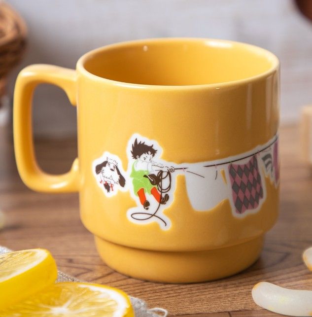 「Perfect Day for Laundry」 マグカップには、ハウルの動く城の心温まるシーンが描かれています。ハウルの弟子であるマルクルがソフィーの洗濯を手伝う姿が描かれており、映画の登場人物全員の親密で家族のような関係が強調されています。人気の火の悪魔であるカルシファーもマグカップに含まれていますが、アニメのこの特定のシーンでは実際には存在しませんでした。
