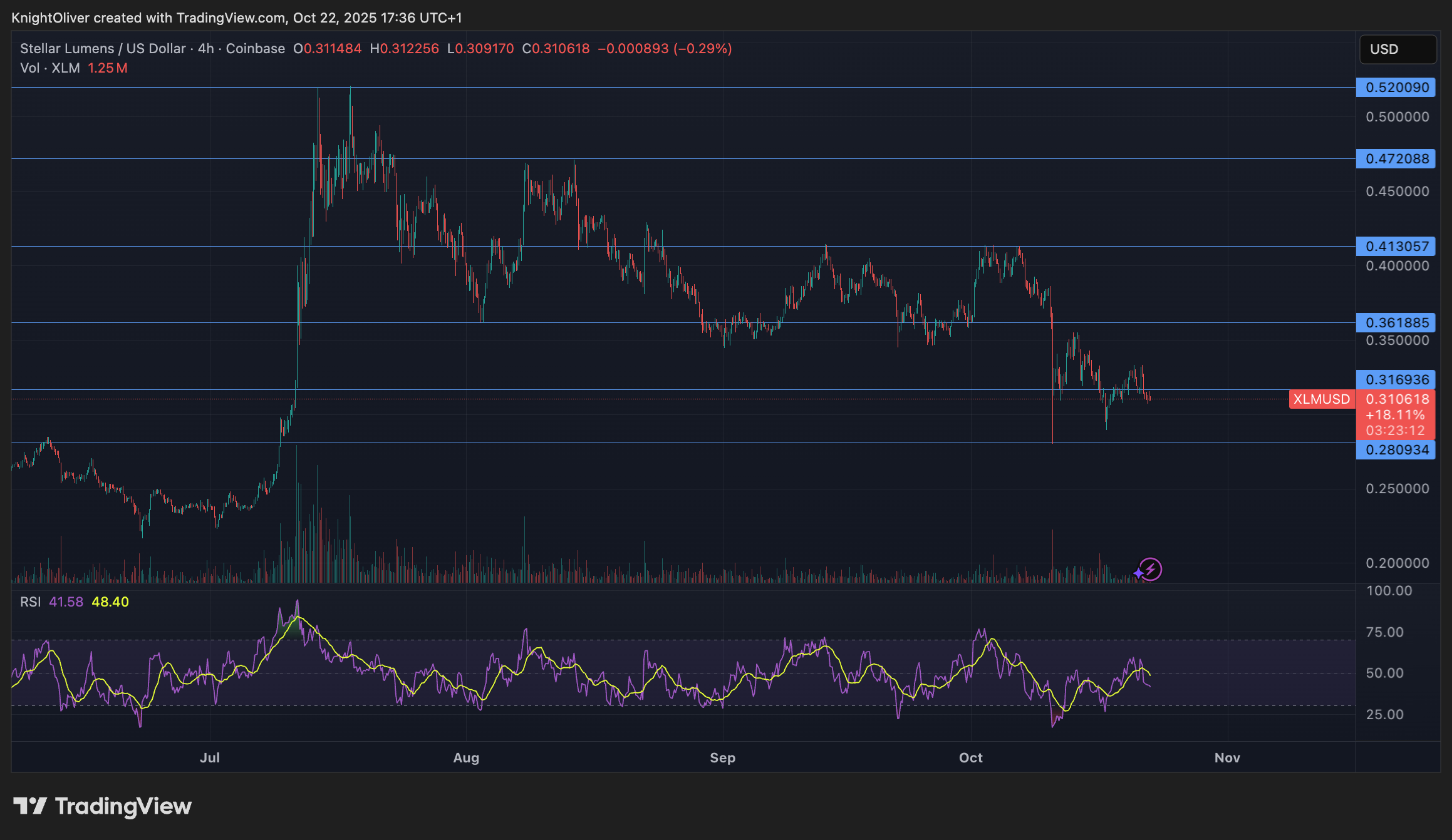 この動きは主に技術的な性質のもので、0.32ドルの突破をきっかけとしたアルゴリズムによる売りと欧州トレーダーの参加増加が下値の勢いを強めた。市場関係者は現在、XLMが0.3100ドルを超えて維持できるかどうかに注目しているが、それができなければ、短期的にさらなる下落への扉が開く可能性がある。 🧭