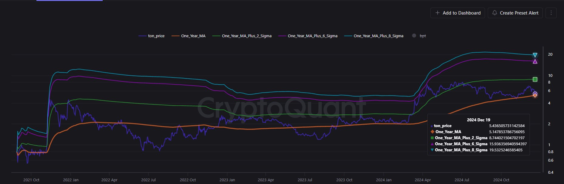 このコストレベルに基づいて、いくつかの段階の統計偏差(シグマ)を考慮して、アナリストはトンコインの潜在的な価格設定マイルストーンを推定し、より情報に基づいた分析を行うために以前の市場傾向と比較します。