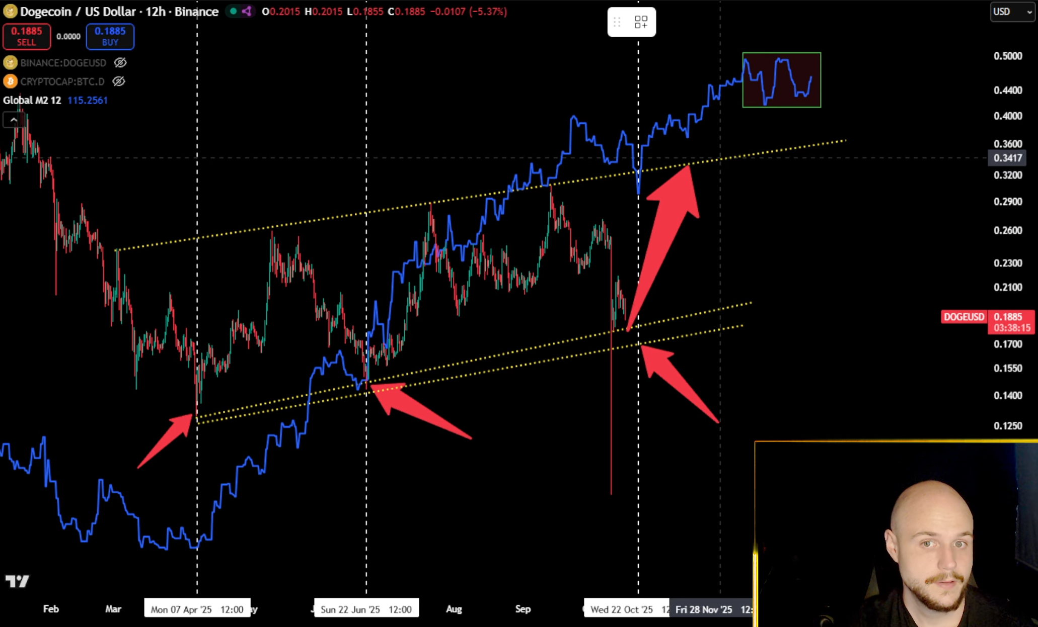 VisionPulsed の事件は、真の暗号通貨の専門家だけが発見できるような、繰り返されるパターンに根ざしています。彼はこの傾向を数か月間追跡してきました。どうやら、ドージコインは、日足のRSIが売られ過ぎの領域に入ったときに、サポートトレンドラインに浮気するのが大好きです。これらの瞬間は既視感の暗号バージョンのようなもので、ちょうど月末に M2 マクロの読み取りが強気になったときに起こります。ファンシー!