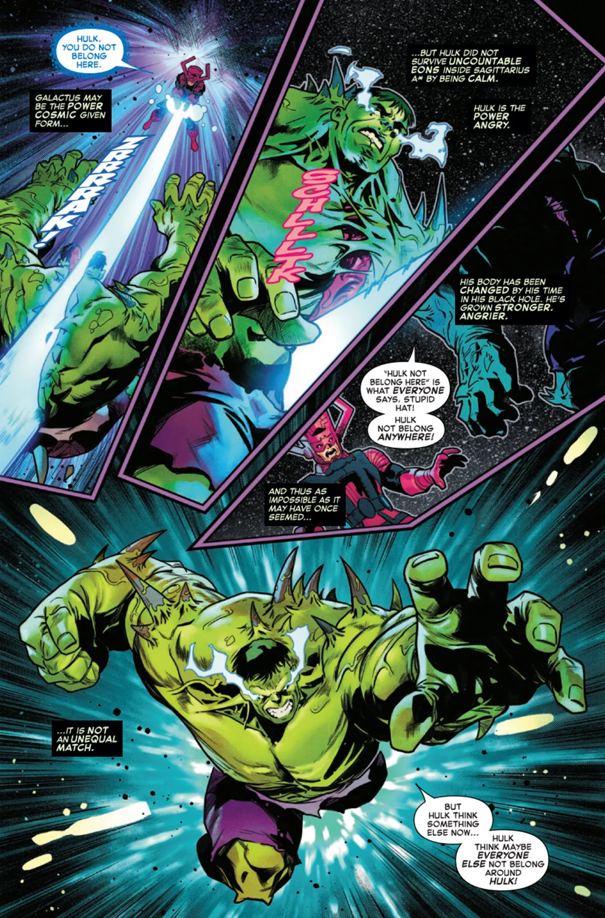 ほぼ空の宇宙に巨大な新生命体が出現し、ギャラクタスの注意を引く。大規模な戦いが始まりますが、ギャラクタスの巨大な力でさえ、信じられないほど強力なハルクを倒すには十分ではありません。ギャラクタスが変身したブルース・バナーと戦ったり、爆破したり、破壊しようとするあらゆる試みは、ハルクの怒りを煽るだけだ。ギャラクタスは生き残るために奮闘しており、もうすぐ敗北するようです。
