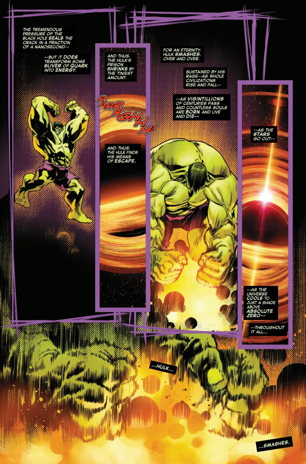 たとえ最強の重力であっても、ハルクを実際に破壊することはできませんが、それは彼に苦痛を与え、それが彼を信じられないほど怒らせます。この怒りが彼の力を刺激し、より怒り、より強く、より大きくなるというサイクルを生み出します。膨大な時間を経て、彼は特異点から解放されるほど強力になります。しかし、これはハルクが巨大なサイズに達した今、できることの始まりにすぎません。