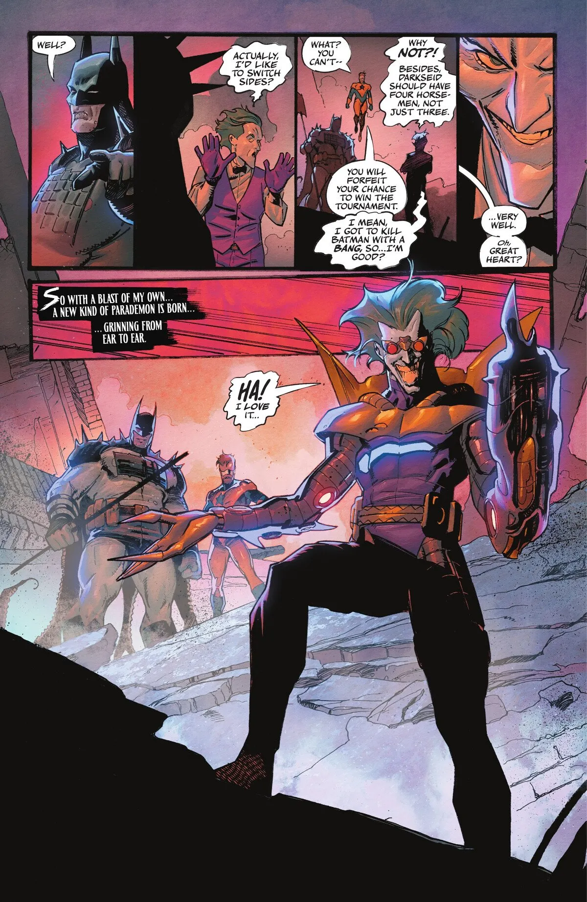 ジョーカーは常に公平な戦いを避けることを好み、他の競争相手を裏切った。彼はダークサイドへの支持を表明し、それが彼の破壊的な性質に合っていると主張した。彼はトーナメントで勝つことに興味はありませんでした。彼の唯一の目標は、バットマンを殺す機会を見つけることでした。