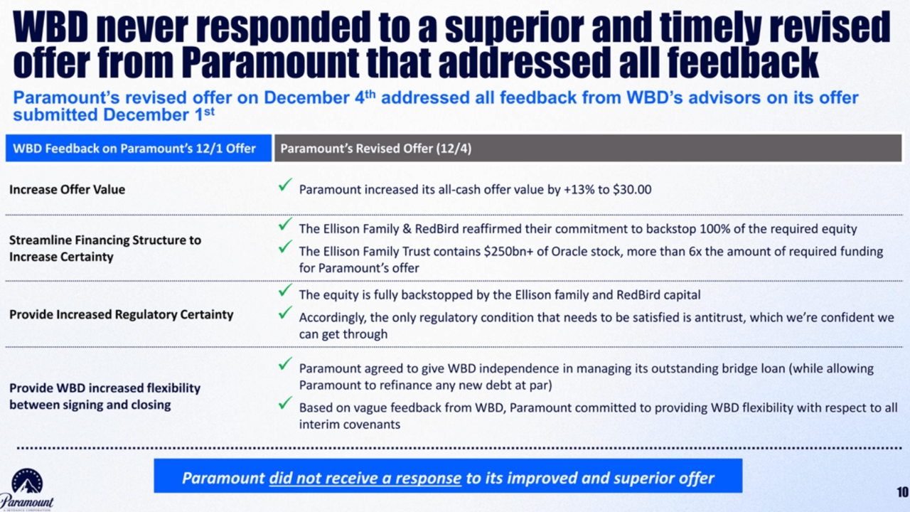 私は10ページの詳細な年表に本当に衝撃を受けました。事態がどのように展開したかを明確に示しており、12月4日に発表されたパラマウントの改善された提案が、ワーナー・ブラザース・ディスカバリーが提起したすべての懸念に直接対処しているのを見るのは驚くべきことです。これにより、取引の全体的な価値が高まっただけでなく、資金調達がより明確になり、それが実際に実現するという確信が全員にさらに強まりました。