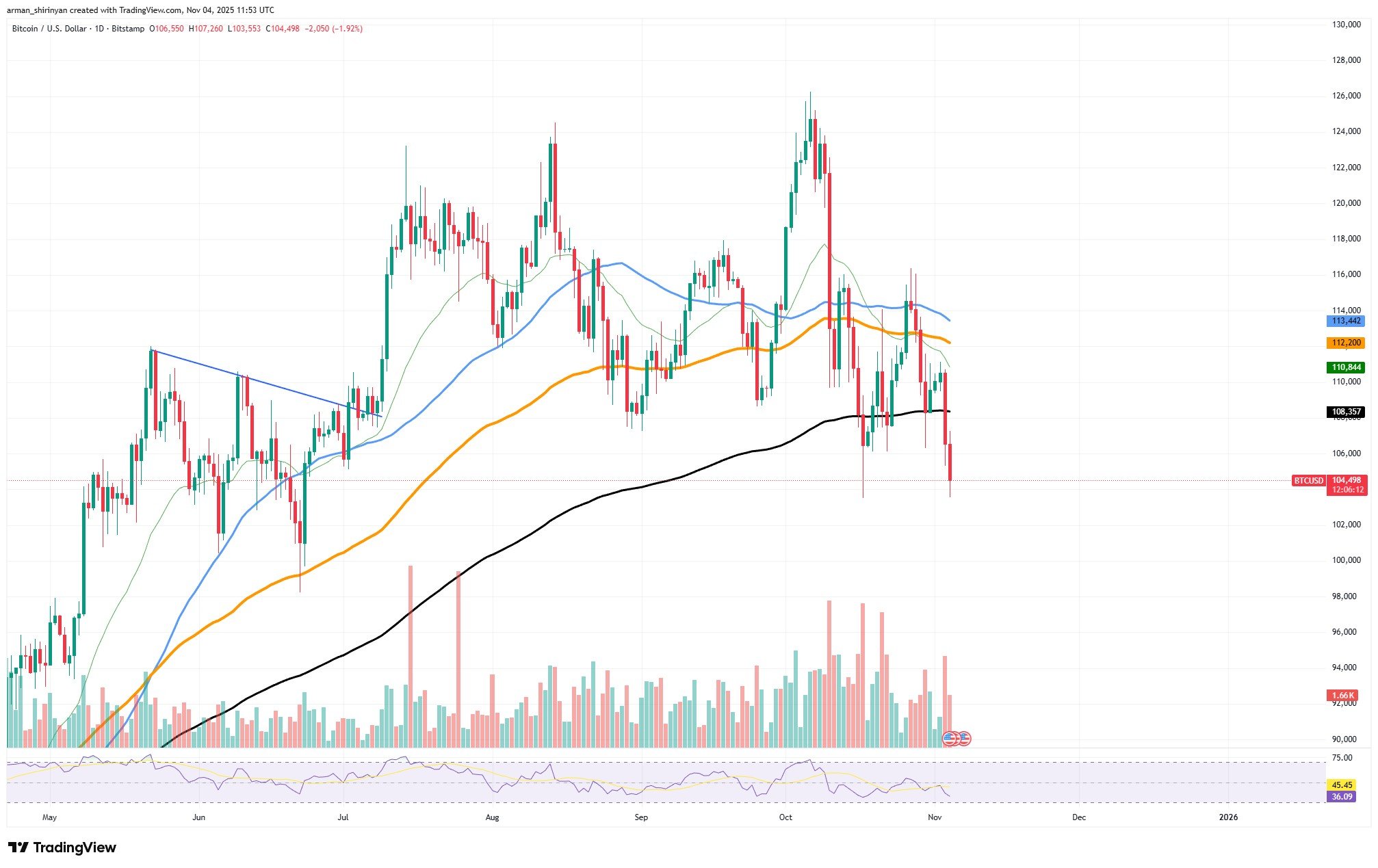 Picture this: Bitcoin hovers just shy of the big 104K, teetering like a cat on the edge of a piano. The poor thing’s been on a bit of a sentimental journey southward, and frankly, it’s making a snuff-up-the-nose kind of exit. The chart’s looking less like a bull and more like a Bowler’s hat-brittle and about to topple.