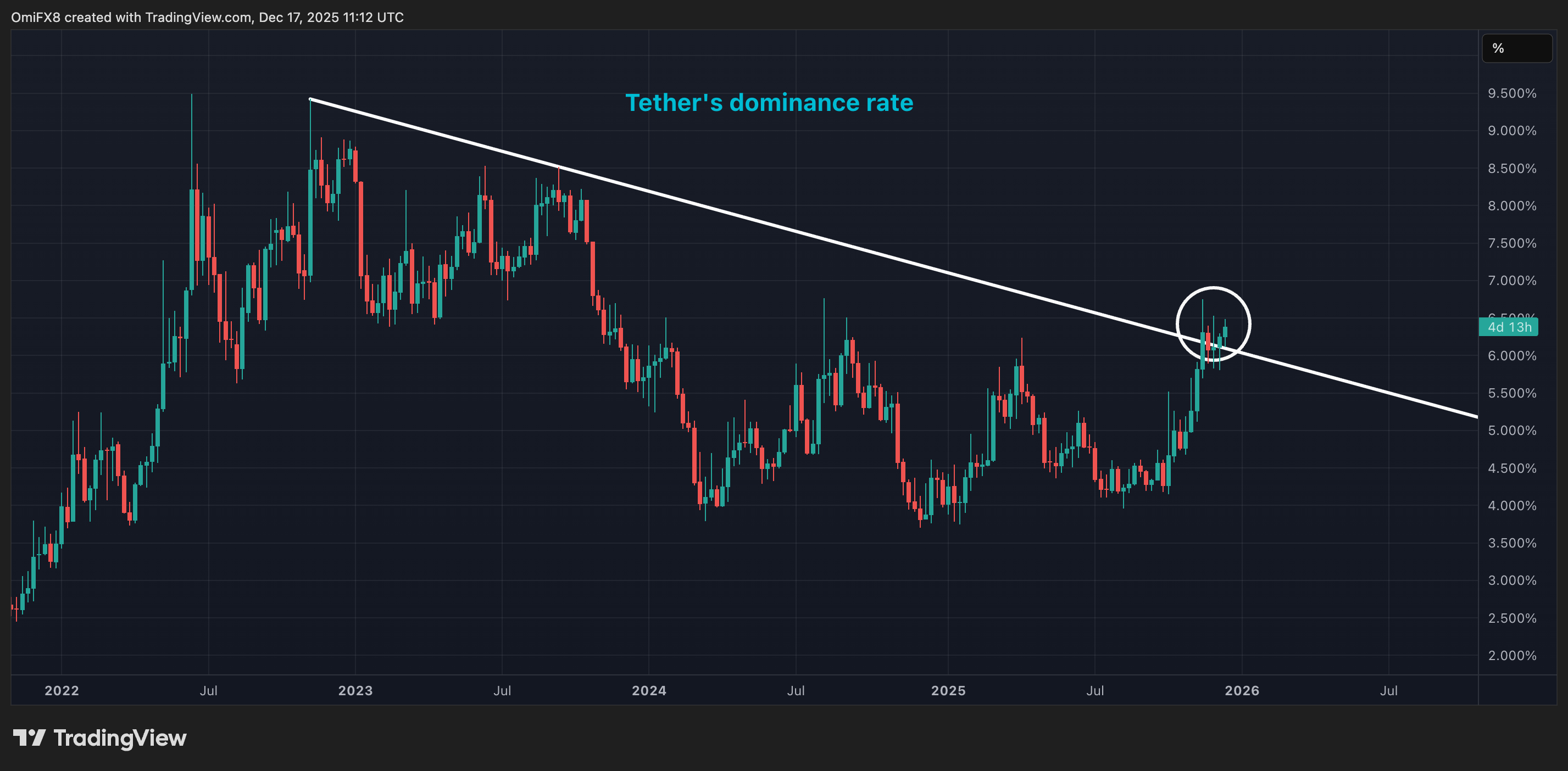 - このチャートは、仮想通貨市場全体におけるトークンのシェアの尺度である最大のステーブルコインであるUSDTの支配力の日々の変化を示しています。 📊