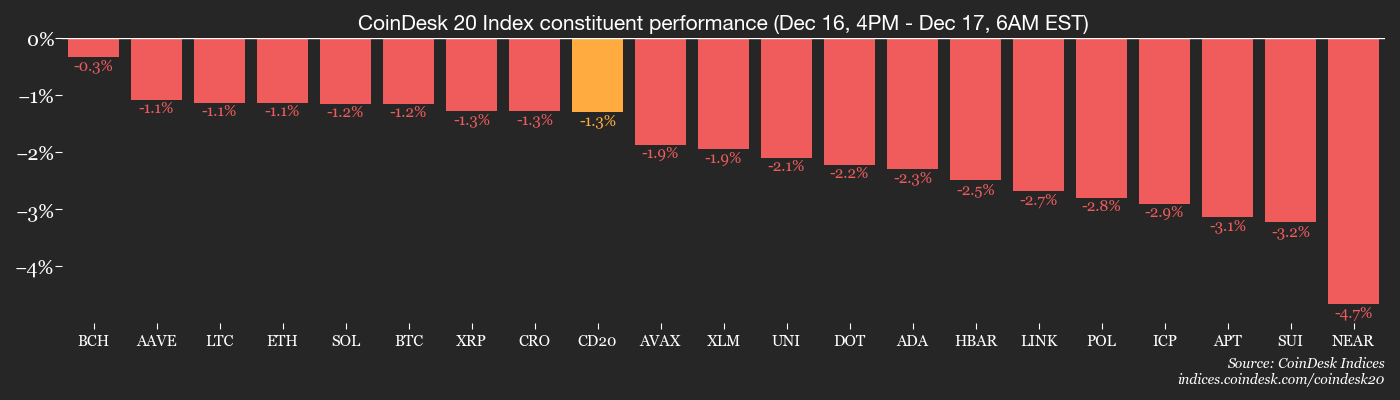 より広範な暗号通貨市場には、24時間で9%上昇したカルダノベースのトークンのような値上がり銘柄もある。 SKYとXMRはそれぞれ4%増加したが、上位100トークンの残りは赤字となっている。 CoinDesk 20 指数と CoinDesk 80 指数は両方とも期間中下落しています。 📉