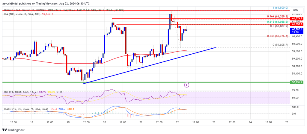 簡単に言えば、価格は61,800ドルの高値から59,805ドルの安値までの最近の下落の23.6%を超えて上昇しました。この上昇傾向は有望に見え、強気派は60,800ドルの抵抗を超えてさらなる成長を目指す可能性があるようだ。