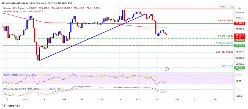 - 価格は58,800ドルと100時間の単純移動平均を下回って取引されている。