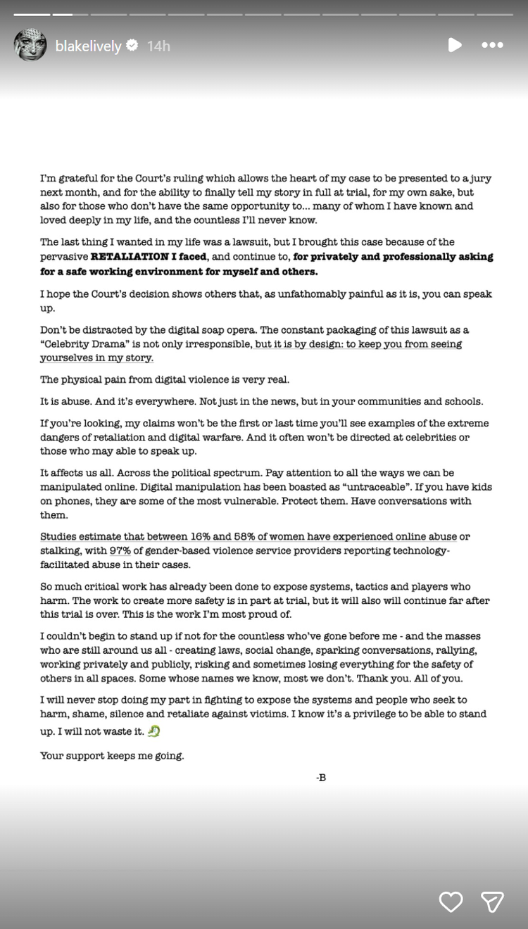 私は大ファンとしてライブリーとスタジオとの法廷闘争を追っていたが、2026年4月2日に事態は大きな展開を迎えた。リーマン判事はハラスメント、名誉毀損、共謀罪など、ライブリーの主張のほとんどを却下した。基本的に、彼は13点中10点でスタジオの側に立った。しかし、残りの 3 つの問題、報復、契約違反、その報復への協力に関してはまだ裁判が行われています。翌日、ライブリーさん自身がインスタグラムでこの判決について発言し、フォロワーに現状を知らせた。