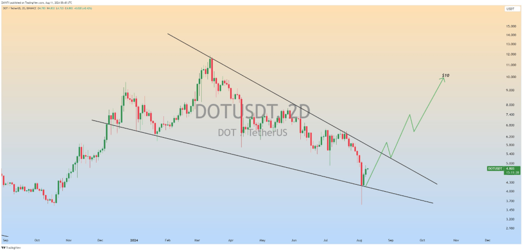 著名な暗号通貨アナリスト「Zayk Charts」の洞察に後押しされて、DOT/USDT をめぐる興奮は著しく高まっています。彼の分析により、このペアの2日チャートで潜在的に重要な下降ウェッジパターンが明らかになり、この展開が極めて重要な変化を示す可能性があることが示唆されました。