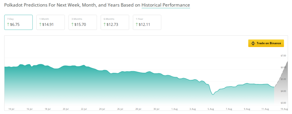 このイベントが発生すると、トークンの大幅な回復が期待できます。さらに、アナリストは、今後 6 か月間で、ポルカドットは約 180% 急増すると予測しています。 1 年以内に、その成長率は 166% という驚異的な数字に達すると予測されています。