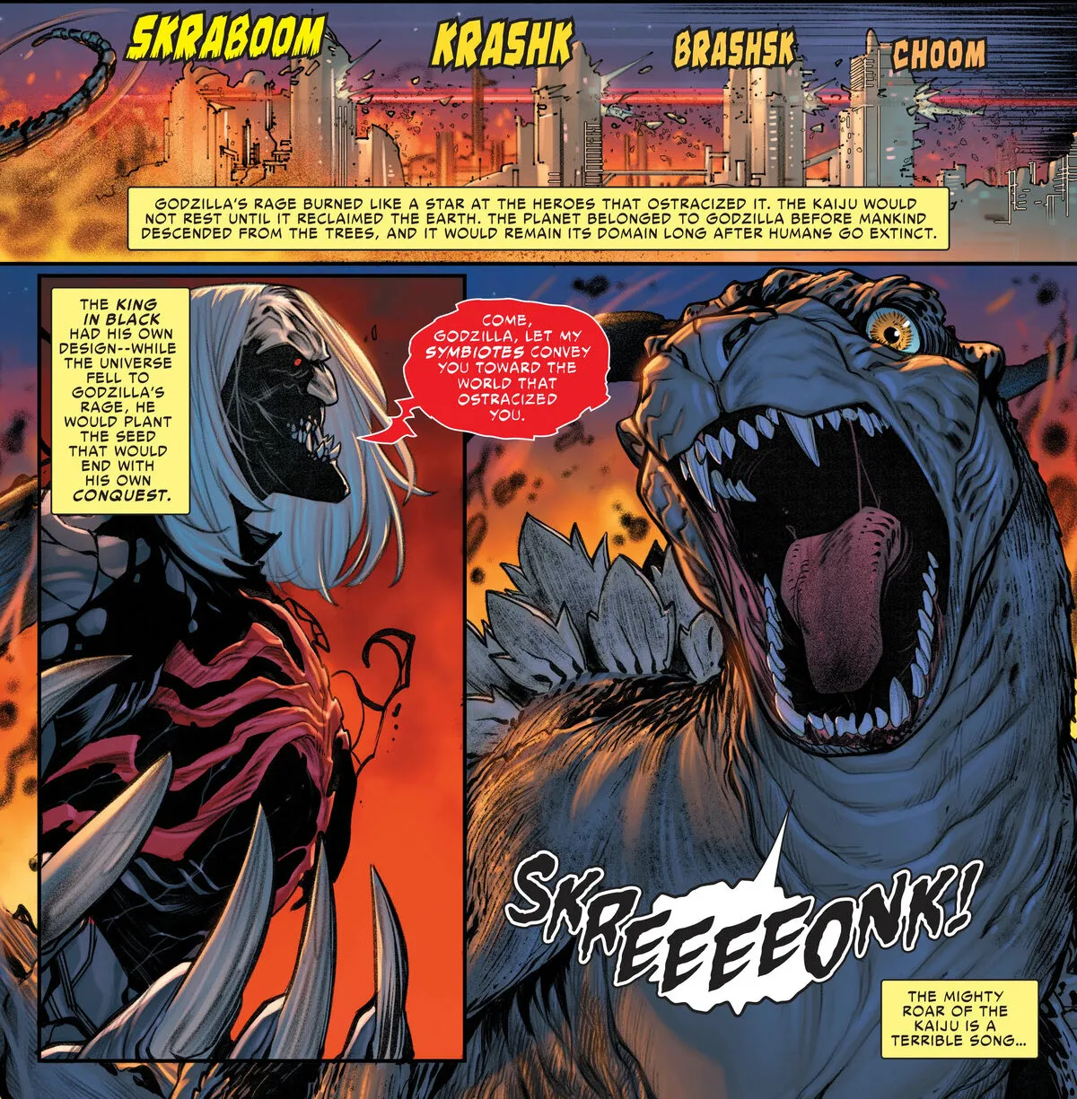 ジェリー・ダガンが執筆し、ハビエル・ガロンとイグ・グアラがアートを担当したゴジラ: インフィニティ・ロアーの第 2 号では、ゴジラがマーベル・ユニバースを破壊するの続編で、ゴジラは予期せずシンビオートの神であるクヌルと同盟を結びます。その後、この危険なデュオはマーベル ユニバースを横切り、地球を目指して破壊的な旅に乗り出します。