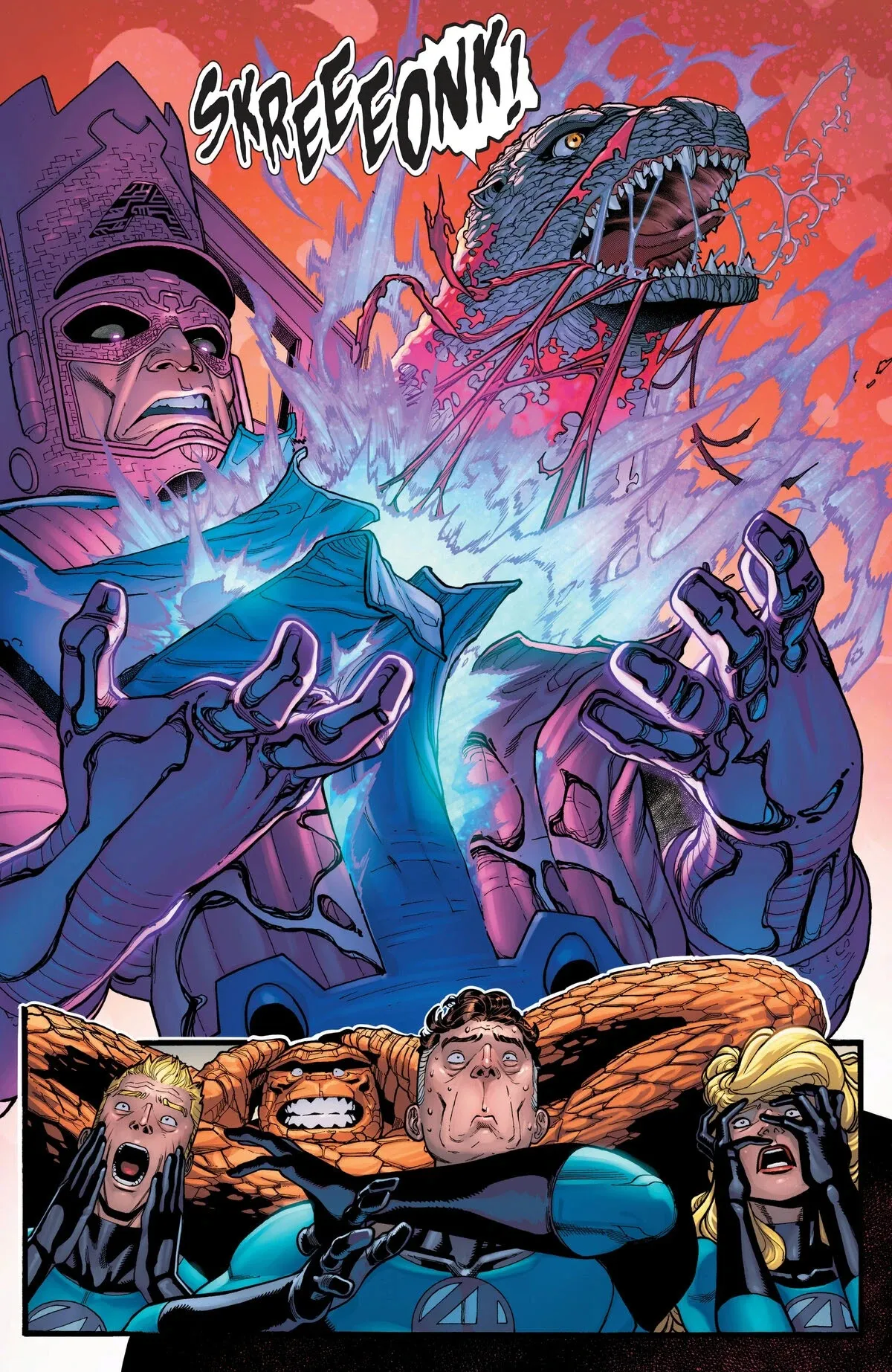 ワカンダ帝国を破った二人は、次にシーアール帝国を攻撃した。状況が悲惨に見えたそのとき、ファンタスティック・フォーが介入し、展開中の出来事についてギャラクタスに警告した。ギャラクタスは二つの欲望に突き動かされ、キング・オブ・モンスターと対峙した。彼は、ゴジラのユニークなエネルギー源が彼の絶え間ない飢えを最終的に鎮めることを望んでいた、そしてまた、少なくとも一つの世界がゴジラを単なる破壊ではなく創造の力として見て欲しいとも願っていた。
