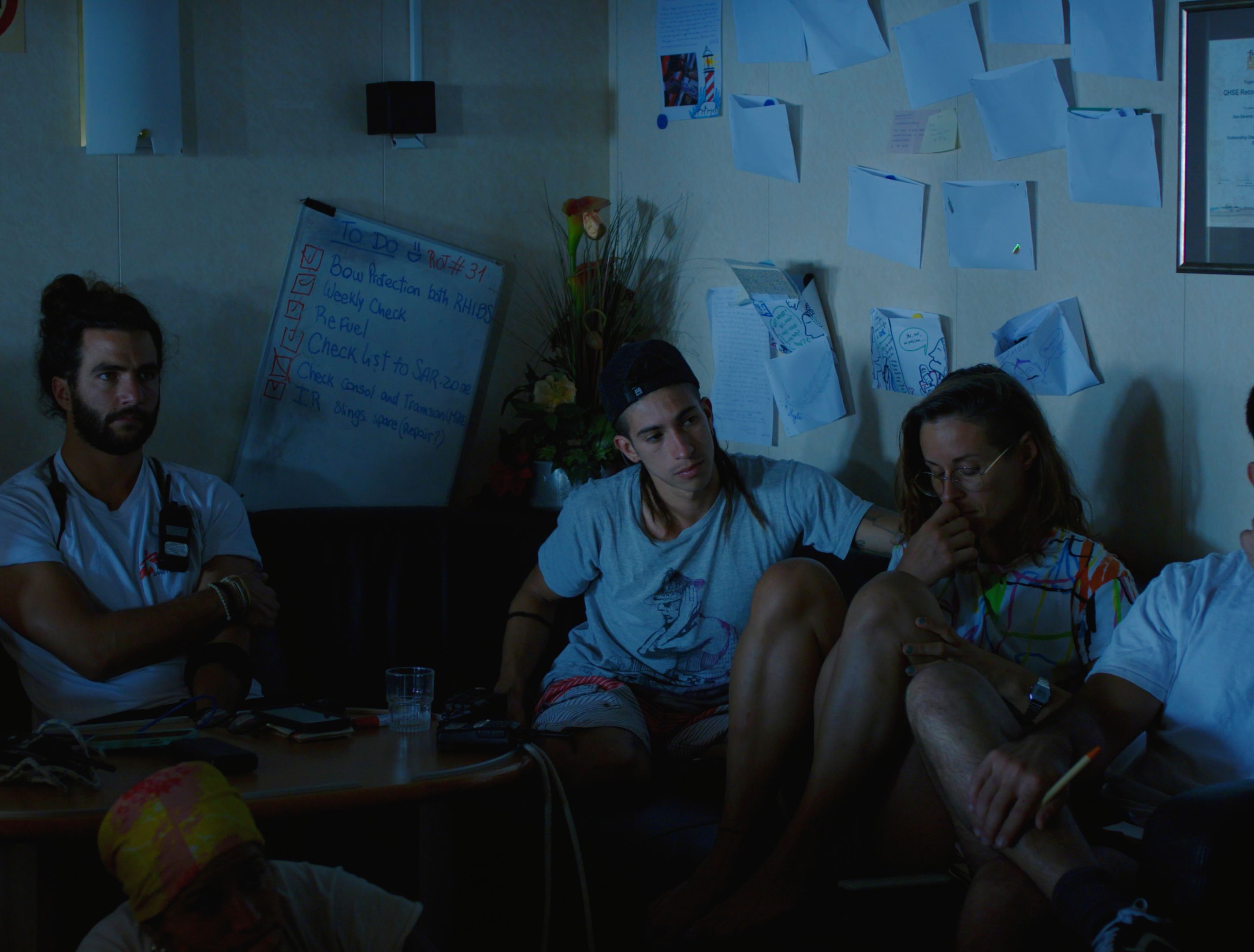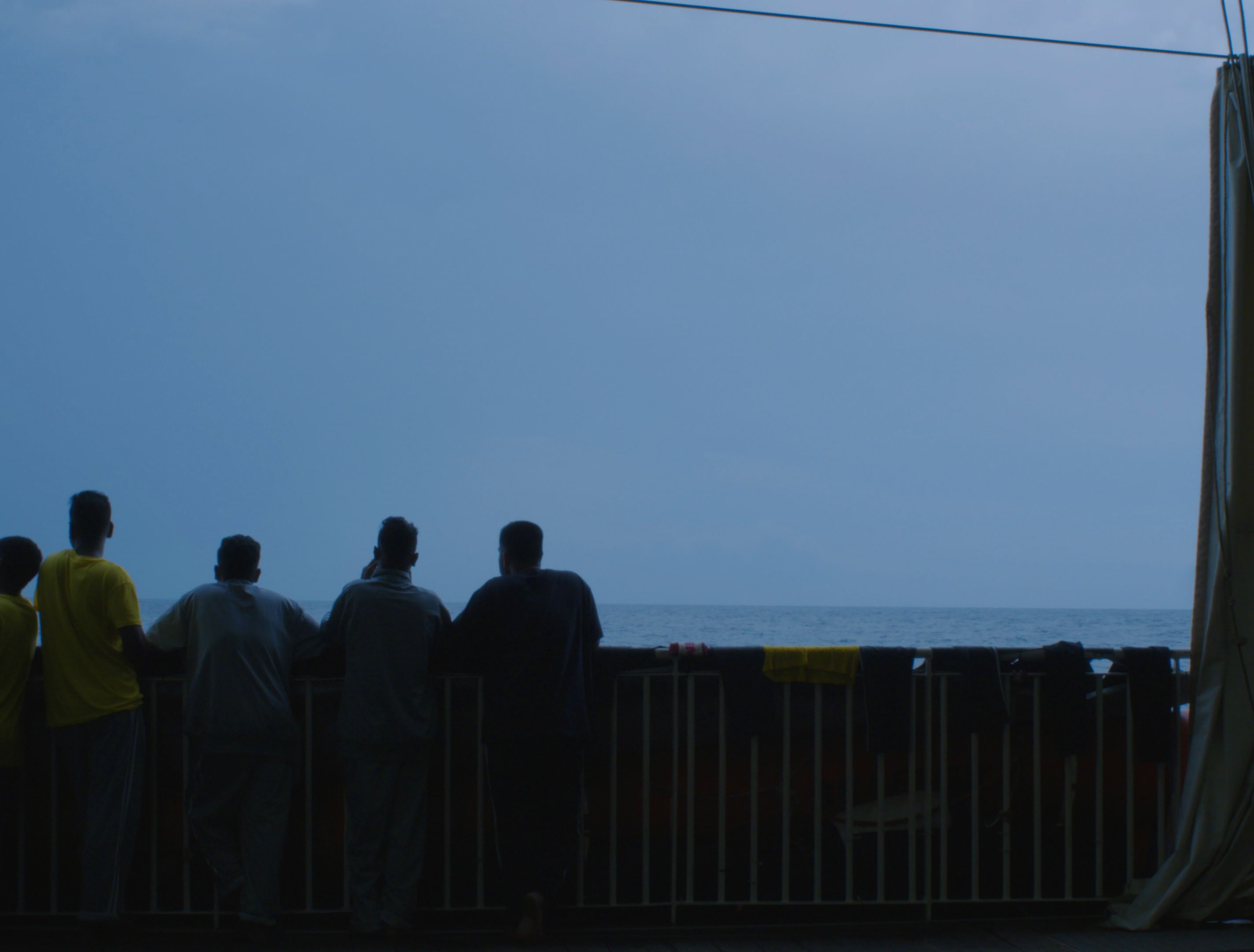 2番目のパート「Sea & Passage」では、アッバス氏が船上で辛抱強く待つ国境なき医師団のボランティアのシーンを織り交ぜながら、海上での移民を巻き込んだ衝突を記録している。乗組員たちが仕事の計画と準備をしている一方で、果てしなく続く海を眺めたり、フーズボールの試合を楽しんだりするなど、静かな休憩時間の瞬間も経験しているのがわかります。その後、アッバスはビデオから静止写真に移行し、意図的に目に見えるぼかしを加えて撮影します。この文体の選択は、彼のプロジェクトに内在する矛盾を浮き彫りにしている。時間を止めることを目的とした写真は、さまざまな方向に引っ張られる移民たちの絶え間なく変化する旅を描いている。