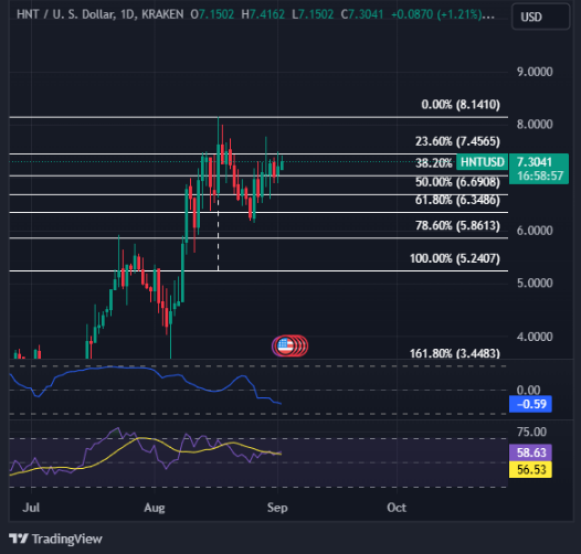 簡単に言うと、HNT の価値は 7 ドルから 7.4 ドルの範囲内にとどまると予想されており、買い手または売り手のどちらかが大きく動く余地は限られています。トークンの適度な強さ指数(RSI)を考慮すると、強気派が現在の取引範囲内で勢いを増す機会となります。