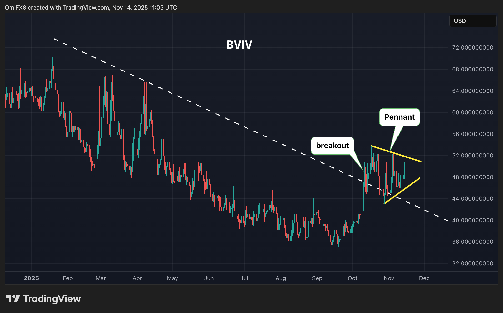 - The chart shows daily moves in Volmex’s 30-day bitcoin implied volatility index, BVIV.