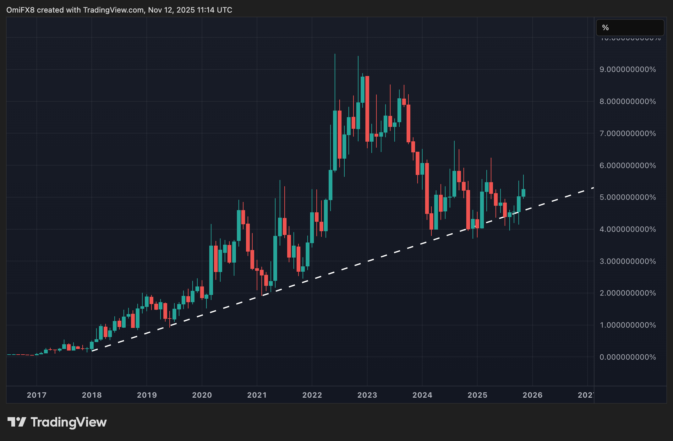 • このグラフは、テザーのUSDT、つまり仮想通貨市場全体に占める世界最大のドル固定ステーブルコインのシェアの支配率を示しています。最も魅力的な光景です! 🎭
