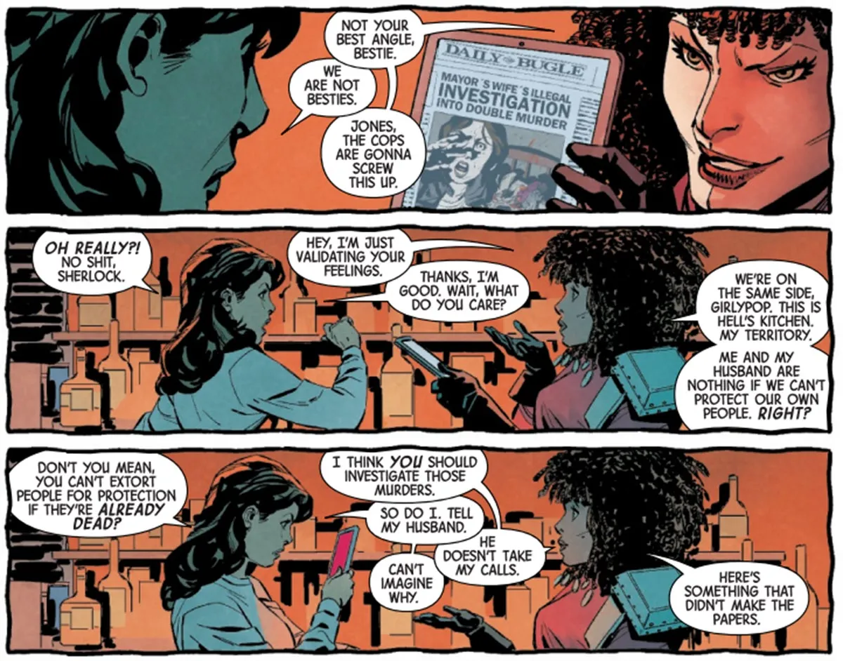 Alias: Red Band #1 の開始時点で、ジェシカ ジョーンズは行き詰まりを感じています。彼女は現在ニューヨーク市長であるルーク・ケイジと結婚しており、子供もいます。しかし、政界は元自警団員が責任者になることに反対しており、ルークが大統領の任にある間はジェシカに私立探偵としての仕事をやめるよう強制した。