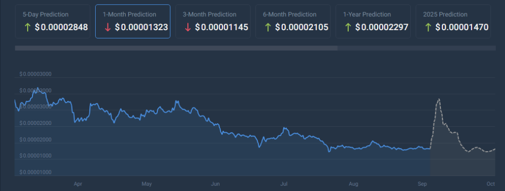 しかし、CoinCodex の最新の推定では、柴犬の短期的なアプローチはより保守的であることが示されています。 SHIBの場合、ほぼ-0.46%まで低下すると予測されているため、ネガティブ性は低いと伝えられています。 2024 年 10 月 18 日の金額は $0.00001323 になります。