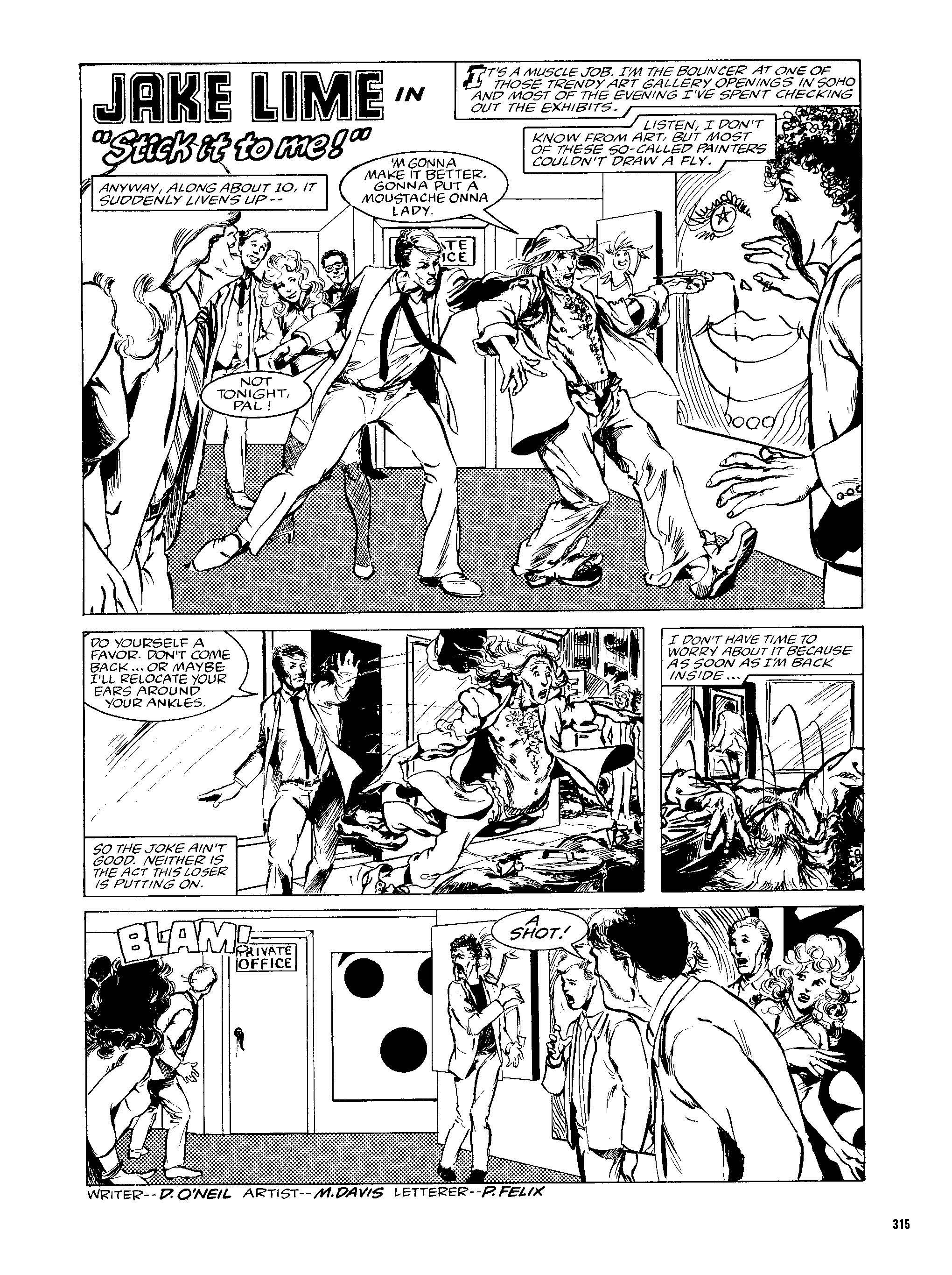 「STICK IT TO ME!のジェイク・ライム」 』は、デニー・オニールとマルコム・デイヴィスによる古典的な探偵小説です。ソーホーのアートギャラリーで用心棒として働くジェイク・ライムが主人公です。彼が酔ったとみられる常連客を追い出している最中に、ギャラリーのオーナーの1人が殺害され、貴重な美術品が盗まれる。
