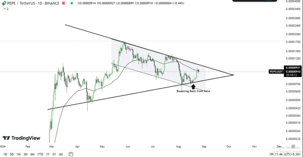 このパターンは、PEPEが最近下限から反発した形で注目されており、このレベルでの健全な買い手のサポートが実証されています。価格は現在トライアングルの頂点に近づいており、ブレイクアウトが差し迫っていることを示しています。
