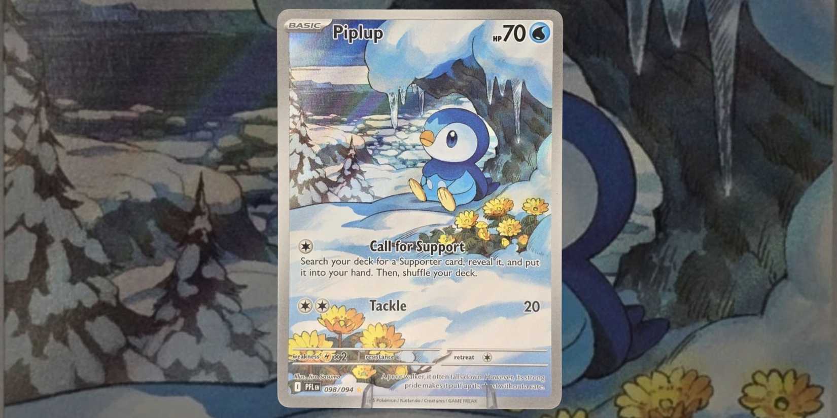 私はポッチャマが大好きなので、そのような素敵なバージョンがファンタズマル フレイム セットで、しかもお得な価格で販売されていることに感激しました。アートワークには、雪の棚の下に座っているポッチャマが描かれています。正直に言うと、それは深く考え込んでいるように見え、おそらく人生の意味についてさえ考えているように見えます。それはただ愛らしいです。