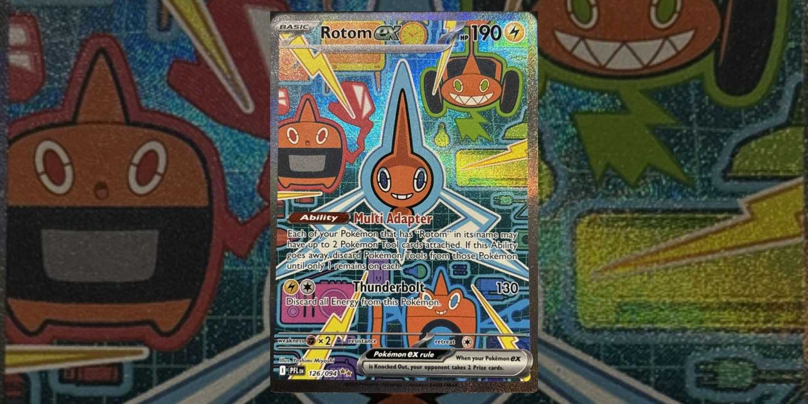 ロトムはさまざまな家電や電話に変身することで知られていますが、このロトム ex カードはそれ自体で際立っています。カードの特別なアートワークには、ロトムのさまざまな姿が背景に垣間見え、古典的な小さなオレンジ色のプラズマボールバージョンのロトムが中心になります。