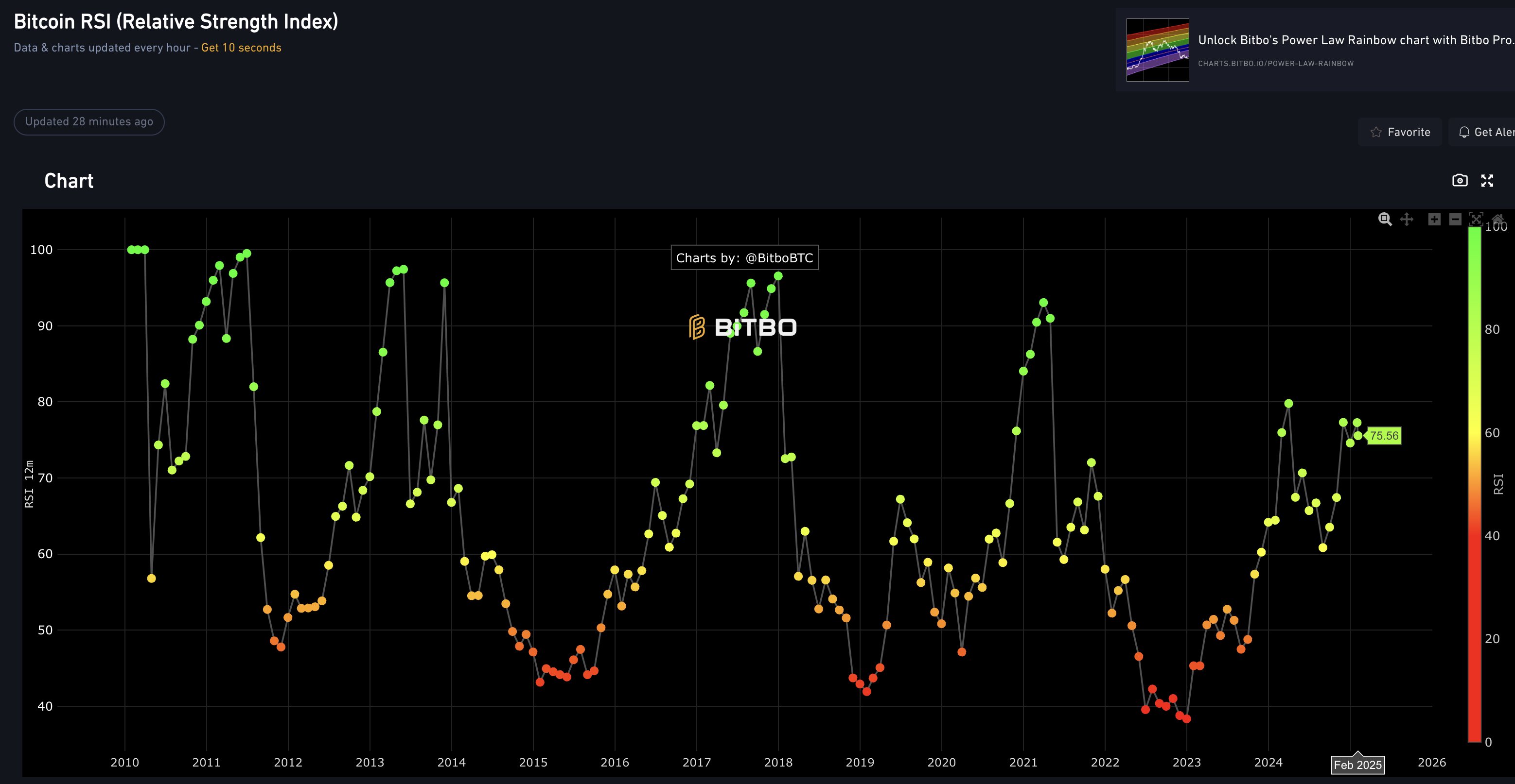 RSI は、買われすぎまたは売られすぎの状態を評価するために最近の価格変動の大きさを測定するテクニカル指標です。「≥ 70: BTC は買われすぎており、まもなく下落する可能性があります。≤ 30: BTC は売られすぎており、まもなく上昇する可能性があります。現在の RSI は 75.56 で、以前のデータと比較すると、BTC はまだピークに達していないようです。」