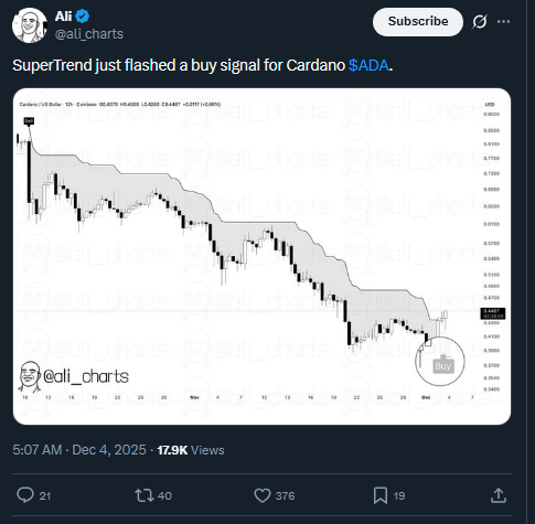 ああ、市場――気まぐれな愛人ですね。テクニカル指標、いわゆる運命の神託は、現在、カルダノのADAが暗号領域の弱者であると宣言しています。見よ、SuperTrend が発言しました。それは、間違いなく買いのシグナルです。毎週の出来高は急増し、 ダイバージェンスは強気の調子を歌っています。