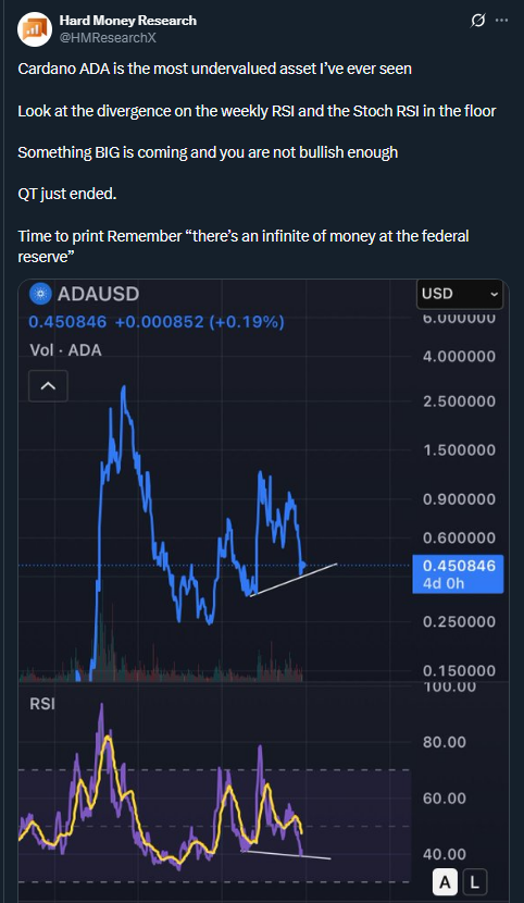 しかし、X に関する HM Research の言葉はよく覚えておいてください。「カルダノは、私がこれまで目にした中で最も割安な宝石です。」驚くべきことに、週足チャートでは、あまりにも明らかな乖離が明らかになり、爆発的な動きを予感させます。運命の前触れである週間 RSI と確率的 RSI は、最低の引き潮を続けていますが、もしかしたら反転への前奏曲でしょうか?