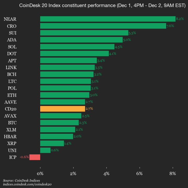 リーダー: NEAR プロトコル (+8.2%) と CRO (+7.6%)。ベルが鳴る前に台本を明確に読みました。 🚀