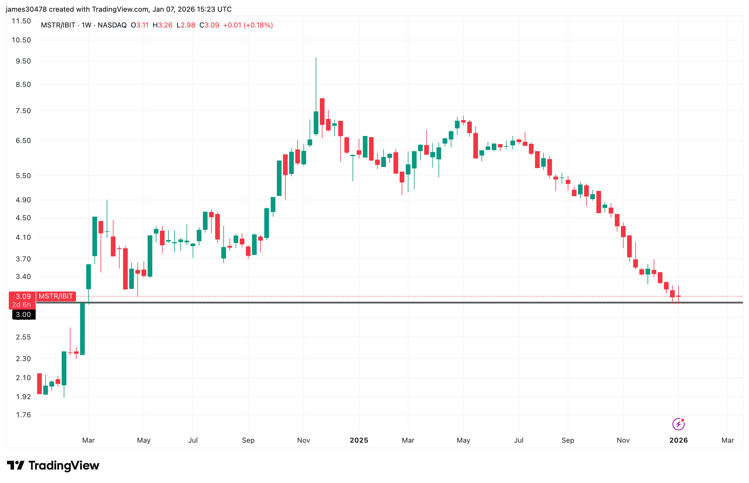 週次段階では、MSTR 対 IBIT 比率は 2 週目に 3 の水準から回復し、現在 3.11 となっています。 2024年3月には、11月に9.5に上昇するまでサポートとして3を保持しており、これはMSTRの史上最高値と一致した。愛する雄牛たちは固唾を飲んで見守っています。 3は成立するのか?時間が経てばわかるでしょう。 🎭