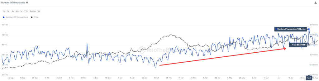 Into The Block による最近の更新では、Tron のネットワークが一貫して強力であり、毎日 800 万件近くのトランザクションを処理し、1 日あたり平均 700 万件のトランザクションを処理していることが示されました。プラットフォーム上のこの大量のトランザクションは、TRX の長期的な成長に大きく貢献しています。