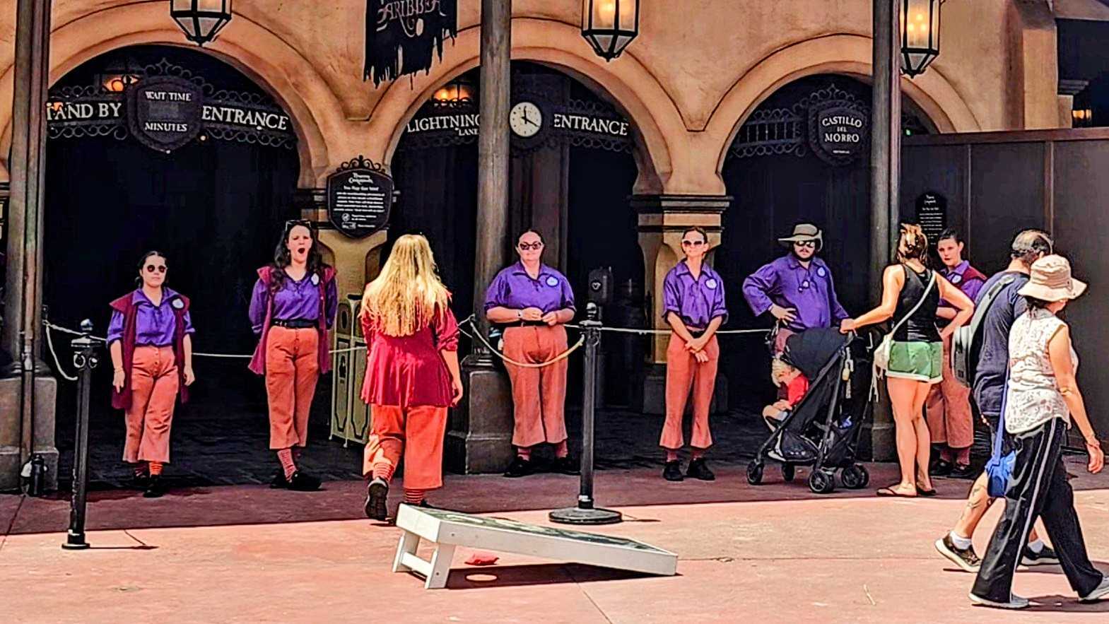 この写真が撮影されたとき、パイレーツ・オブ・カリビアンの乗り物が一時的に利用できなかった間、ディズニーのキャストメンバーはゲストを楽しませるためにコーンホールゲームを準備しました。