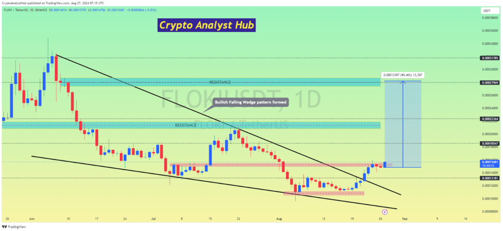 ソーシャルメディアでは、有名なアナリストであるCryptoAnalystHubが、Flokiの価格グラフに強気の立ち下がりウェッジパターンを巧みに描きました。通常、このパターンは、標準的なテクニカル分析の解釈に従って、価格好転の可能性を示唆しています。