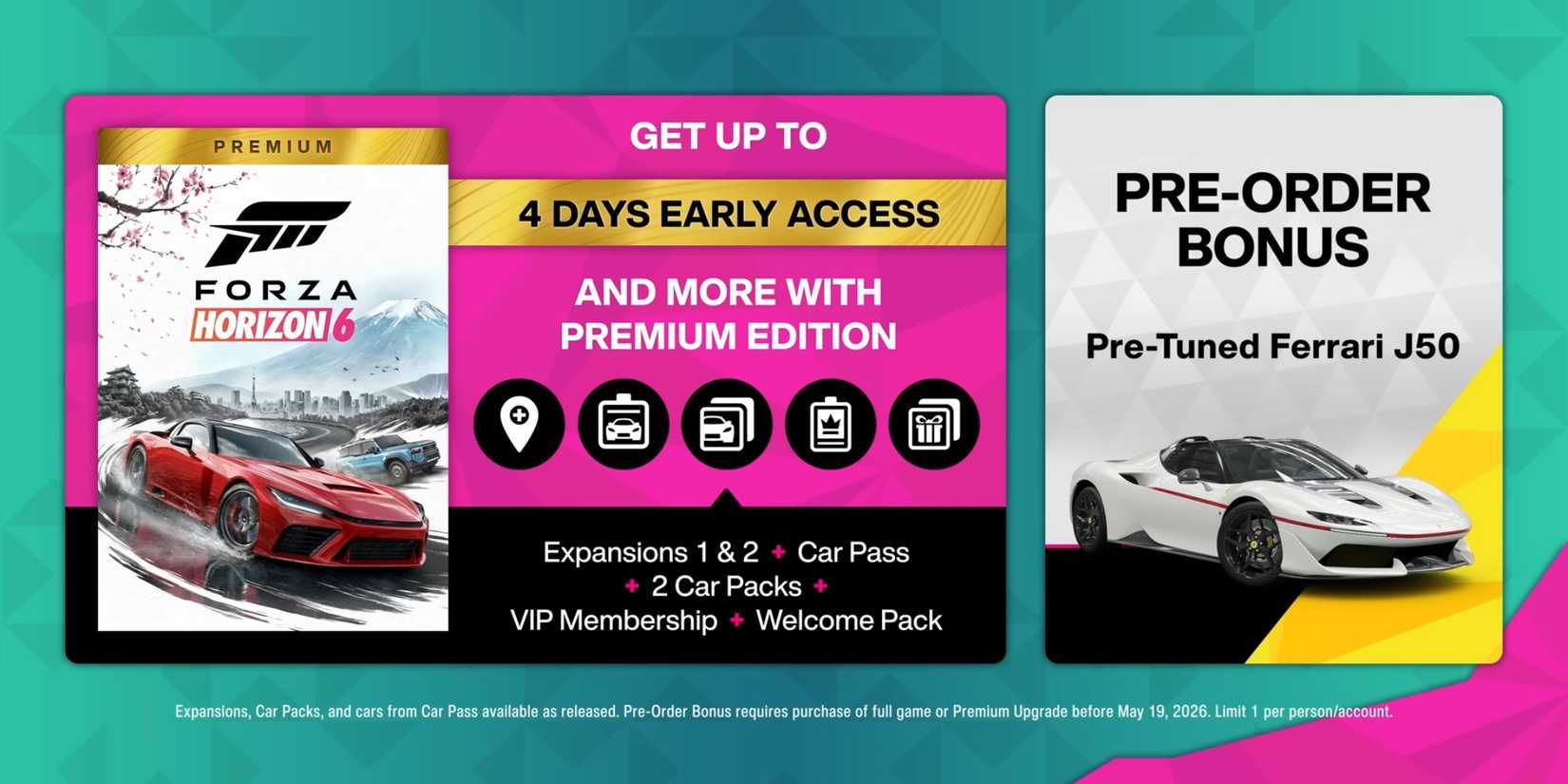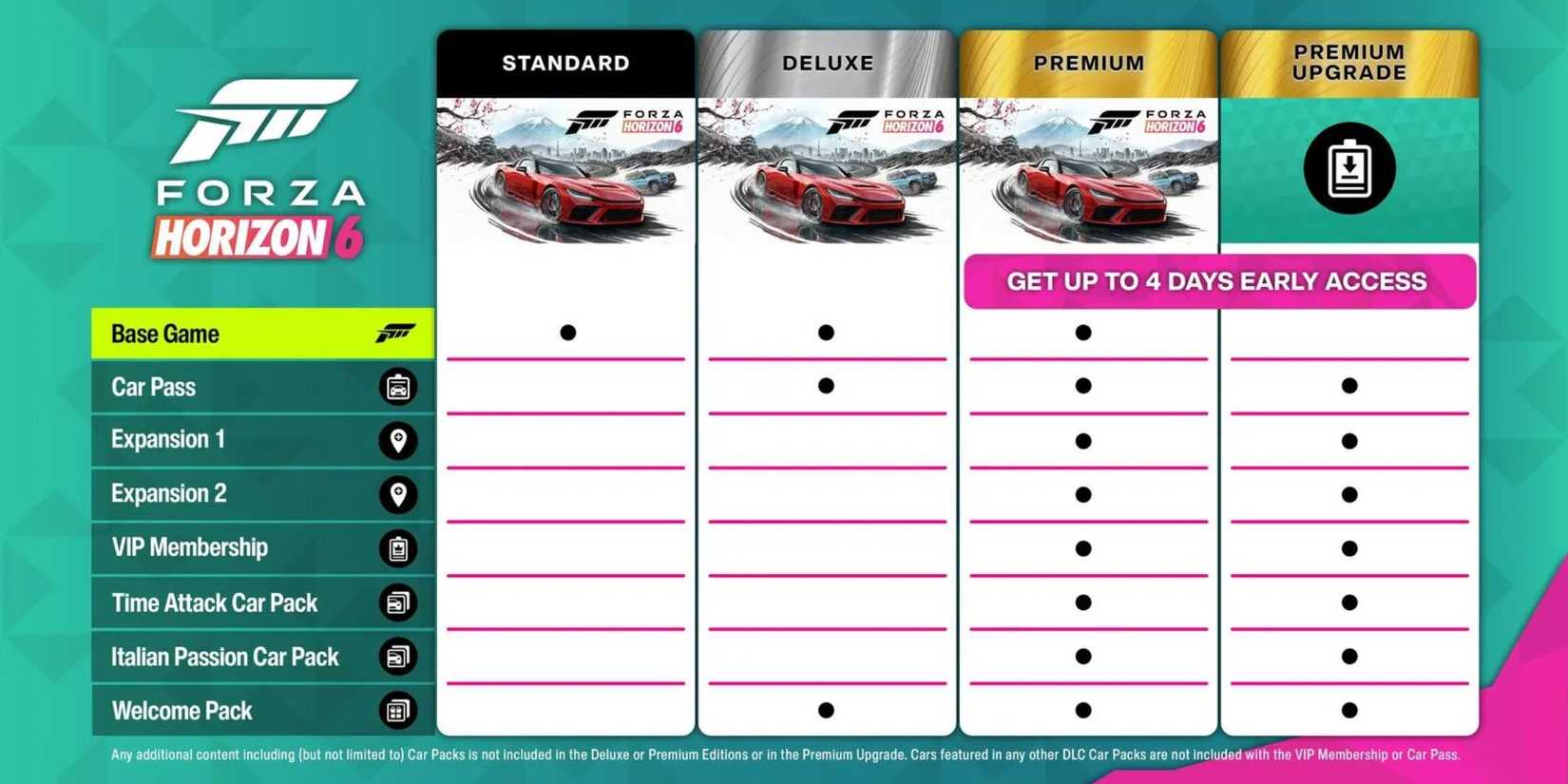 4 日間の早期アクセス、特別な車とカスタマイズ オプション、イタリアン パッション カー パック、その他の特典を含む完全なエクスペリエンスを得るには、プレミアム エディションを購入するか、プレミアム エディションにアップグレードすることができます。プレミアム エディションを購入すると、Forza Horizon 6 用にリリースされる最初の 2 つの拡張にもアクセスできます。