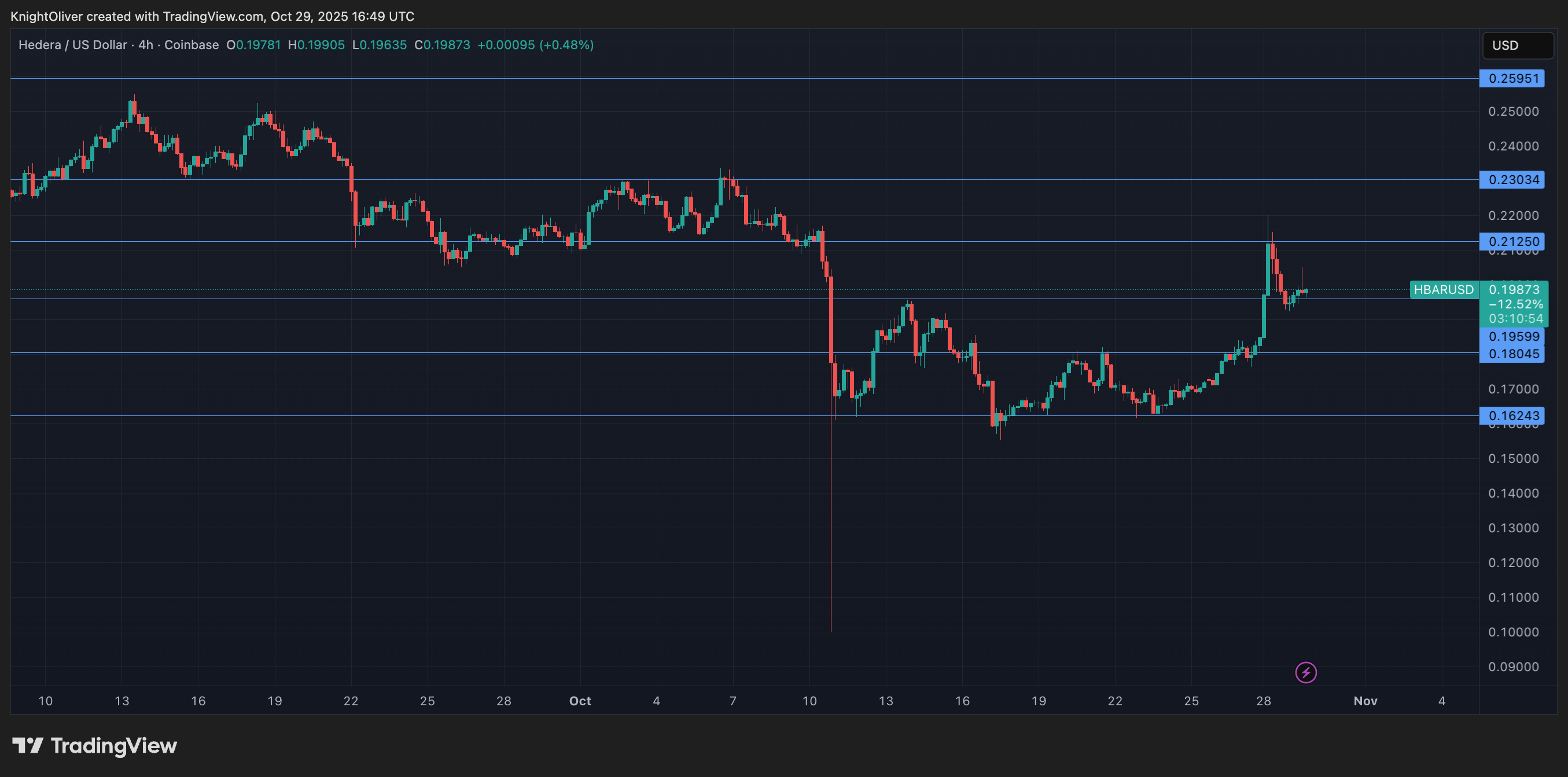 - ナスダック上場のピカピカのHBAR ETFさえもHBARを少し押し上げたが、今はどうだろうか?売り手に戻ります、ベイビー。悪い香水のようにボラティリティが漂っていますが、それがいつ止まるかは誰にも分かりません。