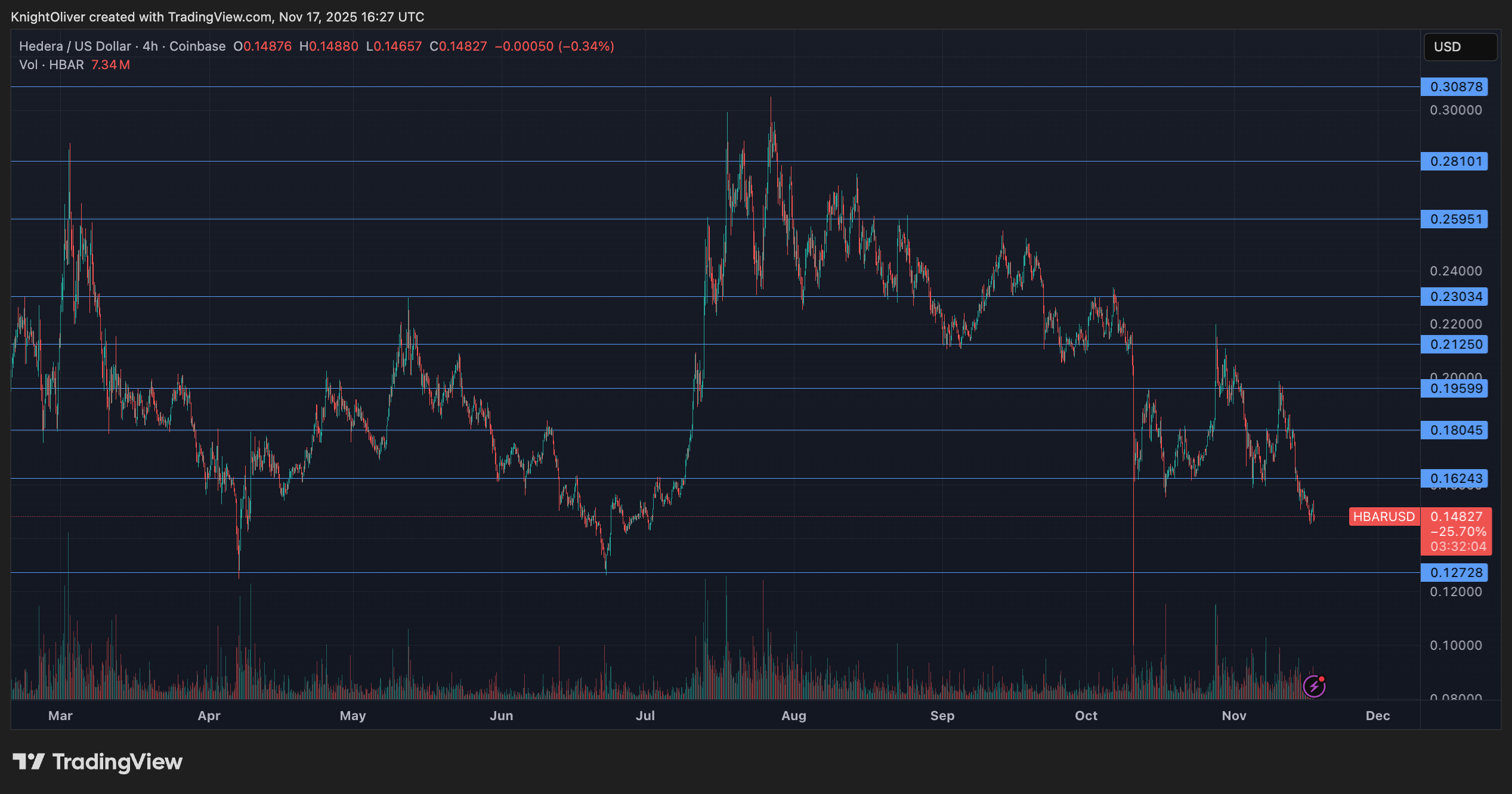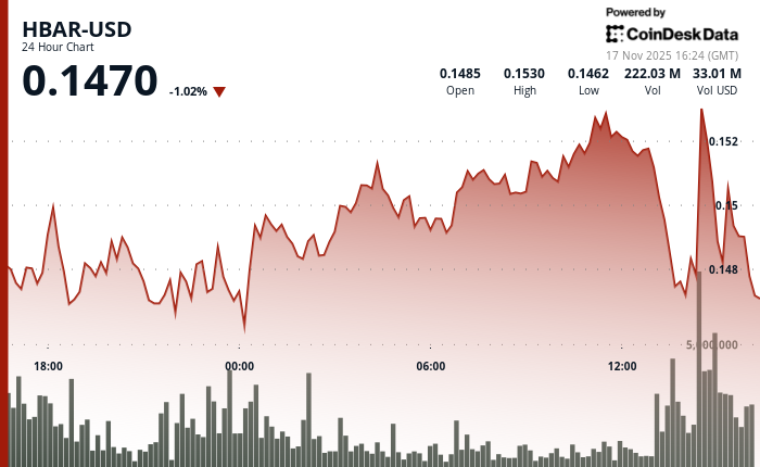 HBARは火曜日に急落し、新たな売りの波を引き起こした重要なサポートレベルを下回った後、0.1518ドルから0.1480ドルまで2.5%下落した。この動きは、11月16日遅くに取引活動が急増したことを受けて行われたもので、平均を94%上回る1億6,890万枚のトークンが取引され、機関投資家への大量流通を示した。 🧙♀️💸