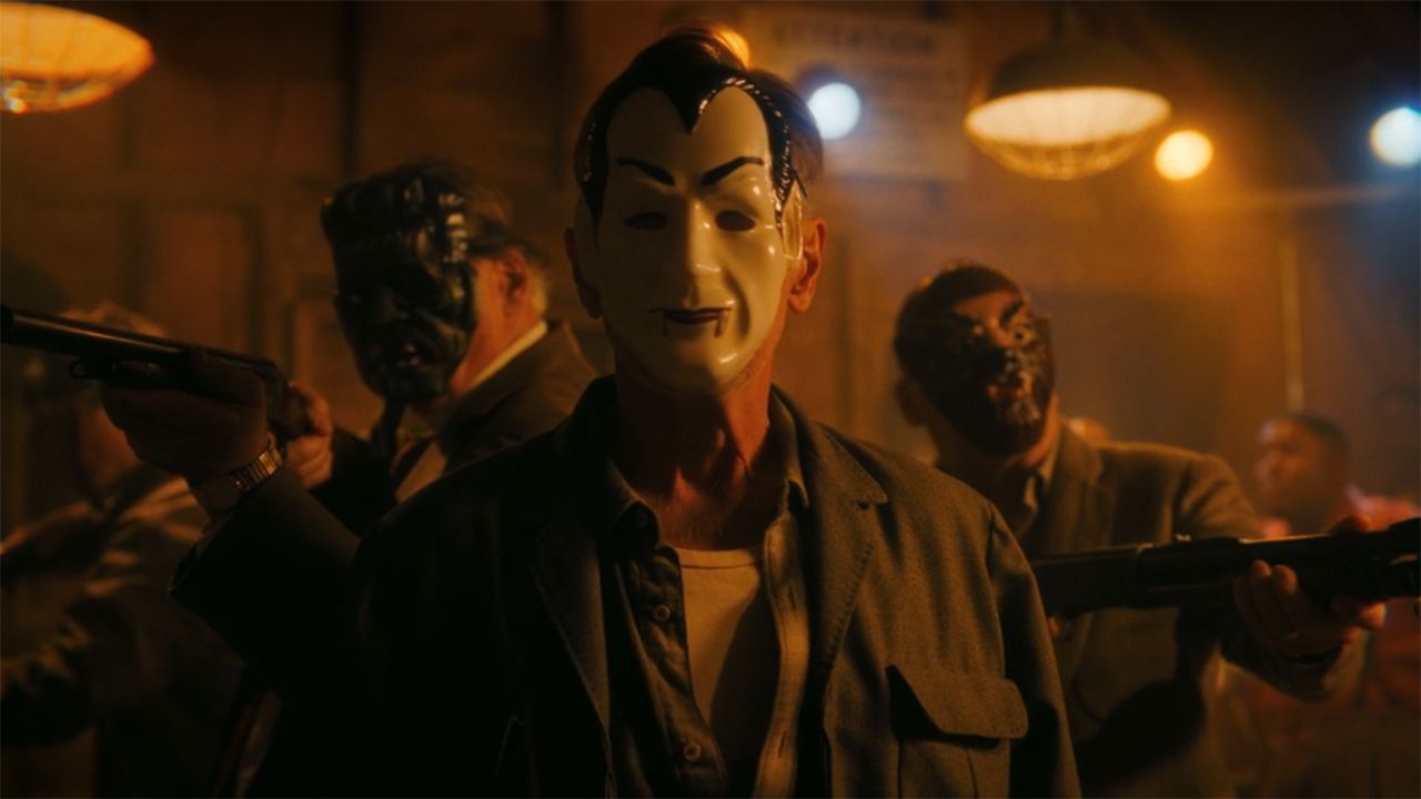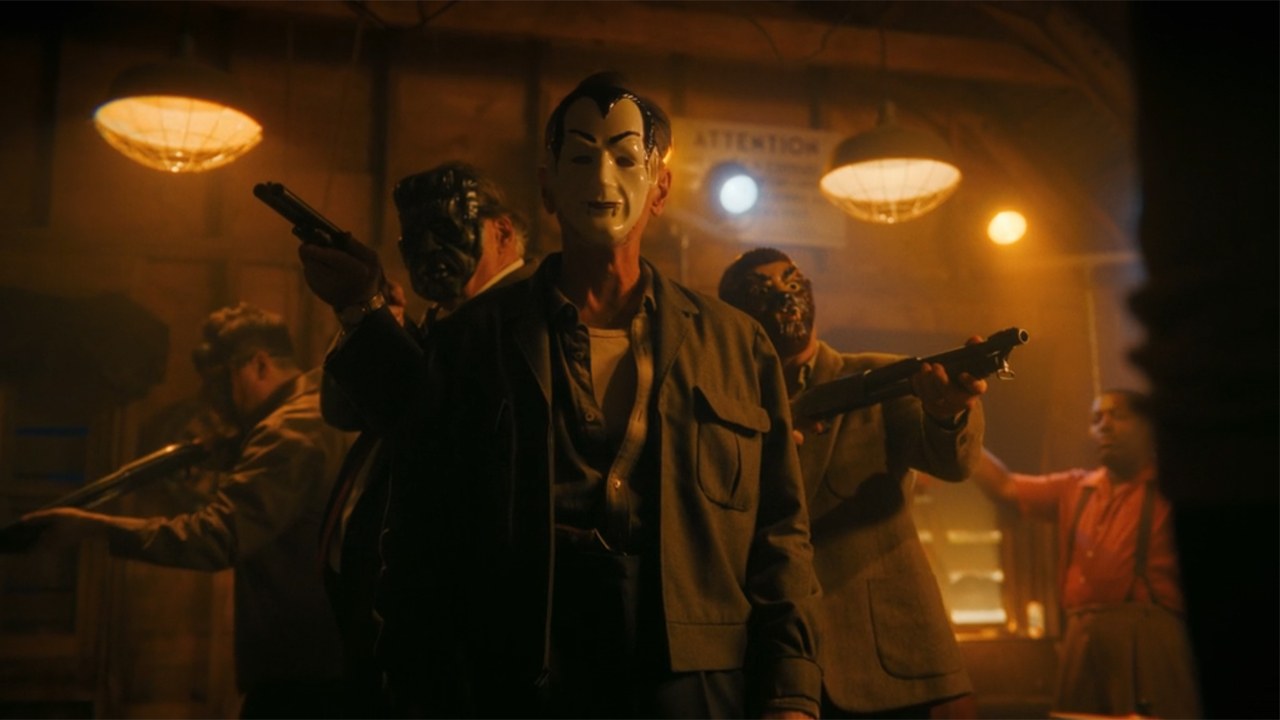 映画ITは概してスティーヴン・キングの小説に忠実でしたが、いくつかの詳細は省略されました。新しい番組IT: デリーへようこそは、クリエイターにそれらの欠けている部分を含める機会を与えます。これはエピソード 3 のスリングショットですでに見られ、「ブラック スポット」でもバウワーズ署長率いる元ギャングが着用したマスクで再び見られました。この本の中で、「それ」という生き物は、ドラキュラ、フランケンシュタインの怪物、狼男などの古典的な怪物としてしばしば登場します。エピソード 7 では、プラスチックのマスクを使用してこれらのルックスに命を吹き込みます。