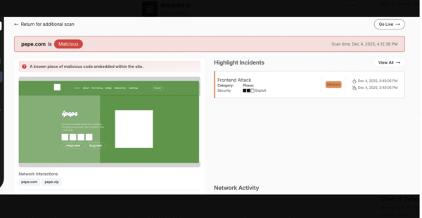 Pepe の公式 Web サイトは 12 月 4 日に破壊的な侵害に見舞われ、攻撃者はそのフロントエンドに Inferno Drainer コードを挿入しました。その後、ユーザーは喜んで悪意のあるページにリダイレクトされました。なぜなら、虚空に叫びながら暗号通貨ウォレットが空になることを望まない人がいるでしょうか? 🎉🔥 党の最弱者である Blockaid は、直ちにプラットフォームを避けるよう全員に警告を発しました。